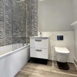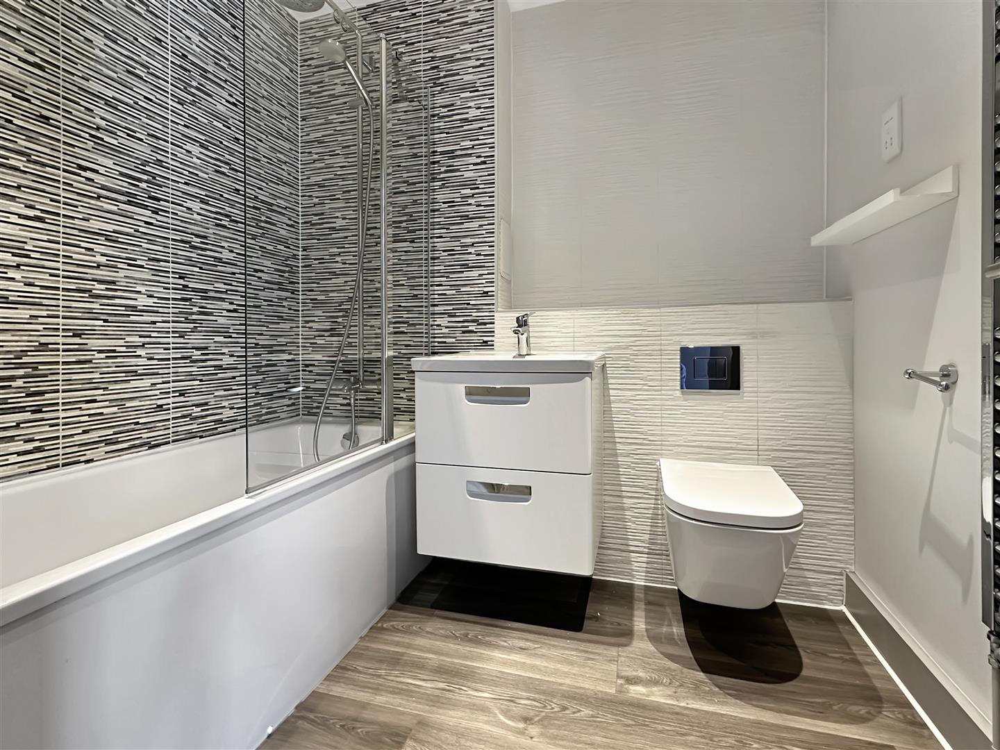 The stylish bathroom features a three piece suite with shower over the bath, part tiled walls and tiled flooring, a chrome heated towel rail and air extractor