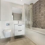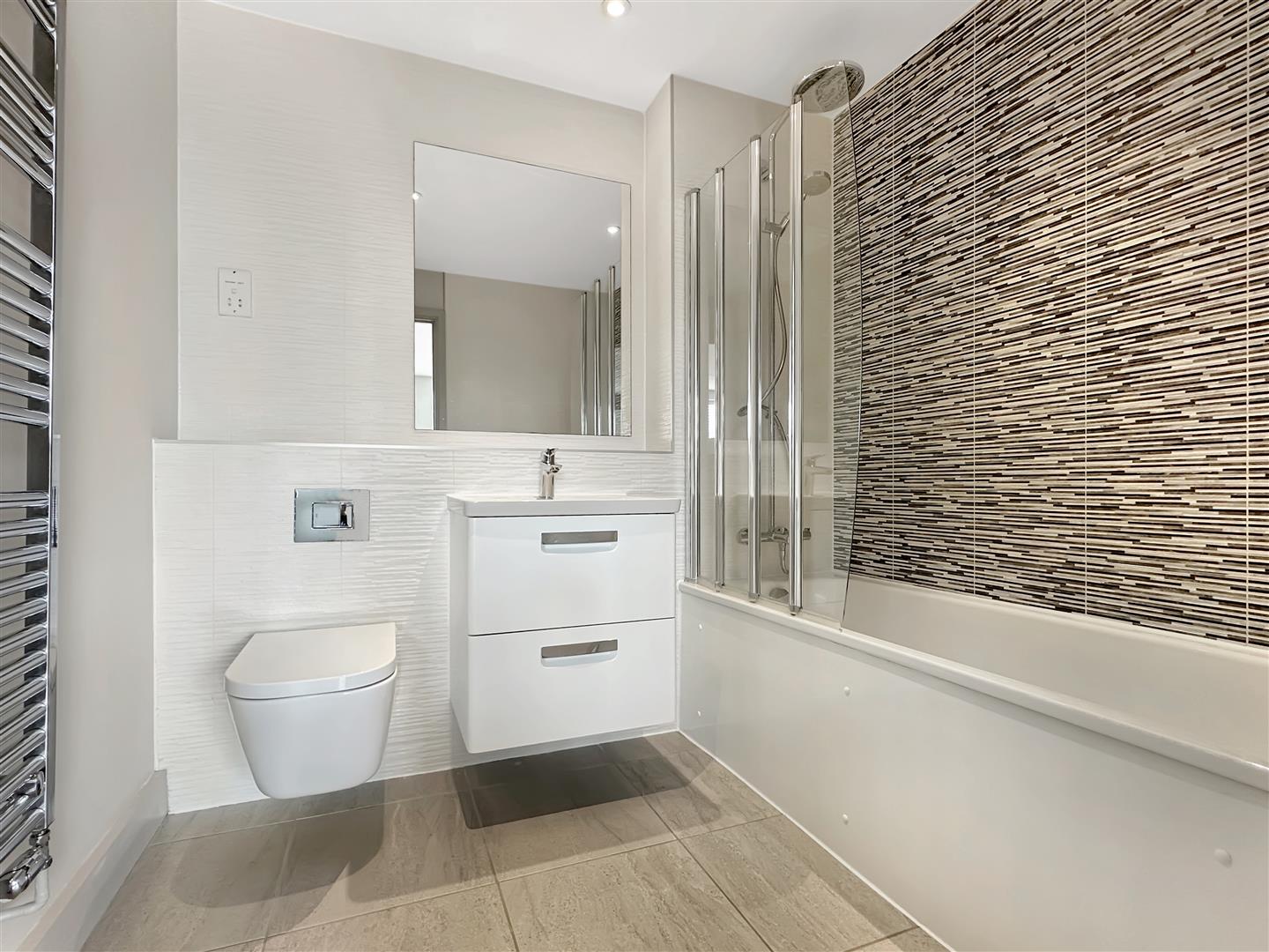 The stylish bathroom features a three piece suite with shower over the bath, part tiled walls and tiled flooring, a chrome heated towel rail and air extractor
