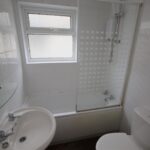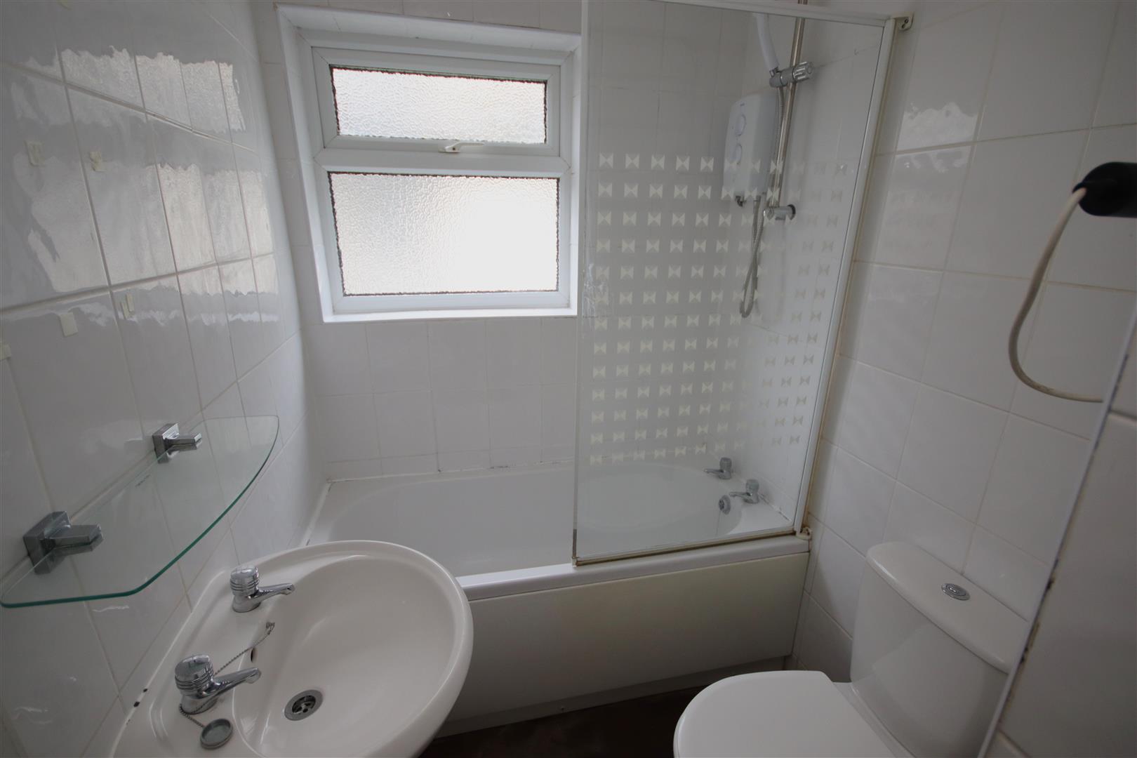 Bathroom with shower over the bath, hand basin and WC