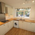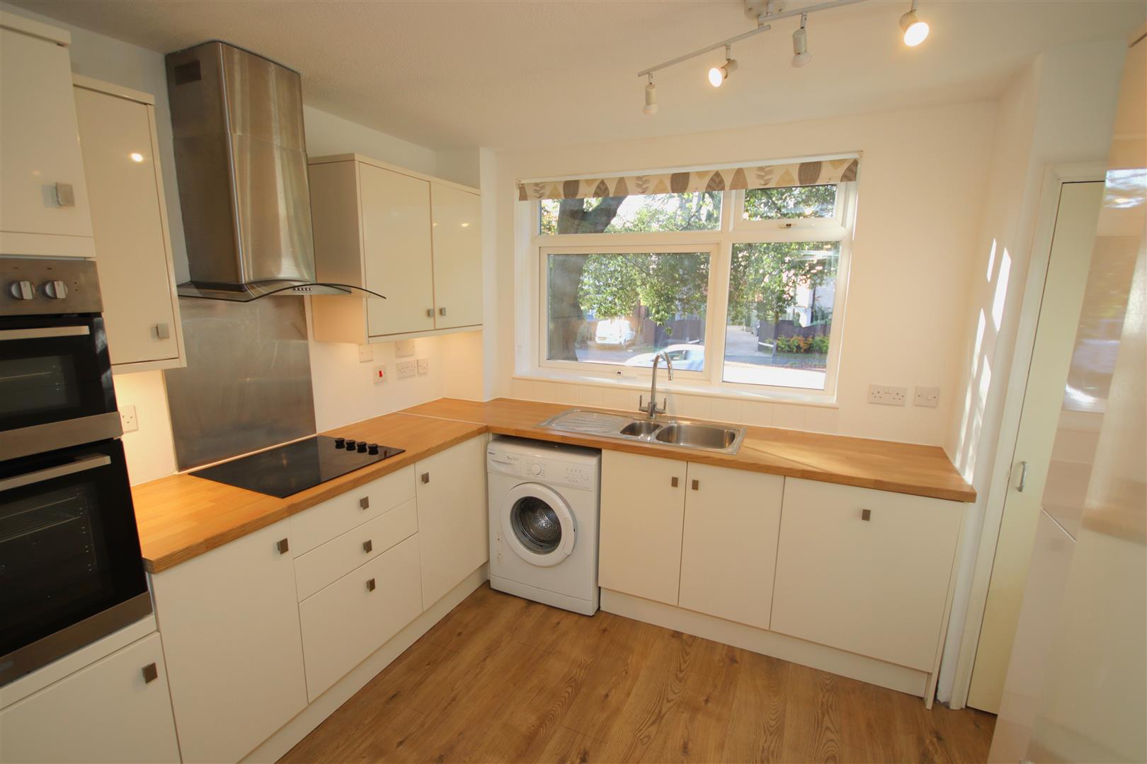 Modern fitted kitchen with electric hob and oven, fridge freezer, dishwasher and washing machine
