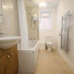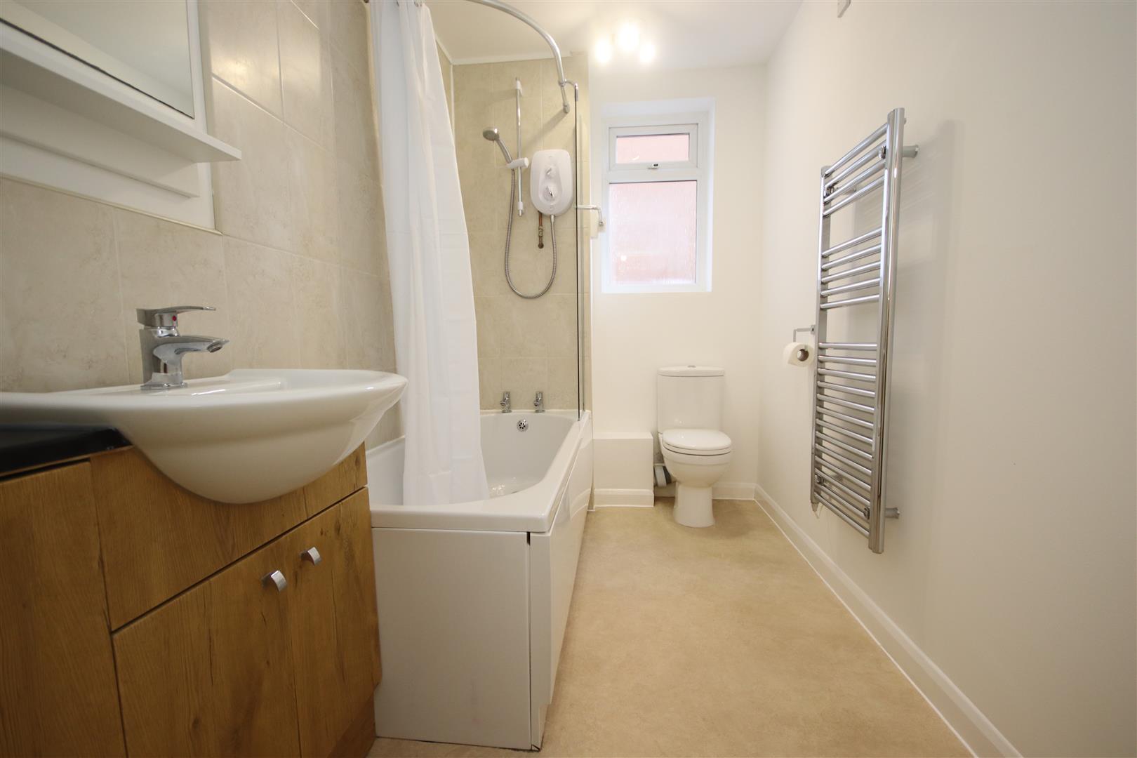 A good sized bathroom with electric shower over bath, WC, hand basin and heated towel rail
