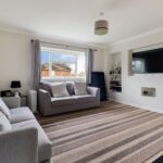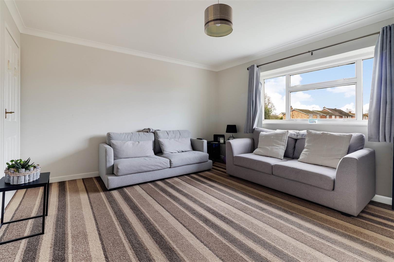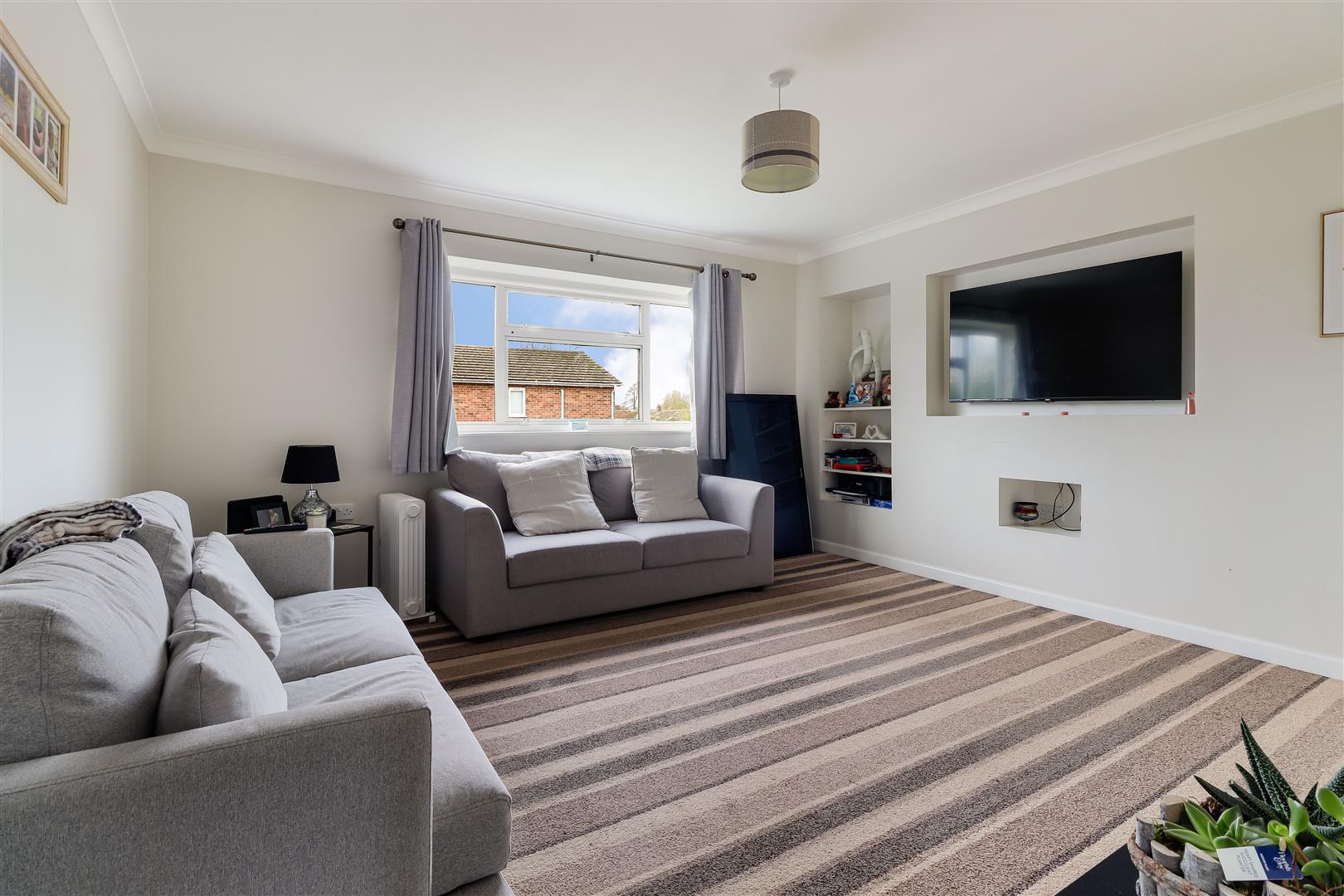 The living room is particularly spacious and features recessed shelving and t.v storage.