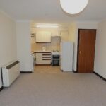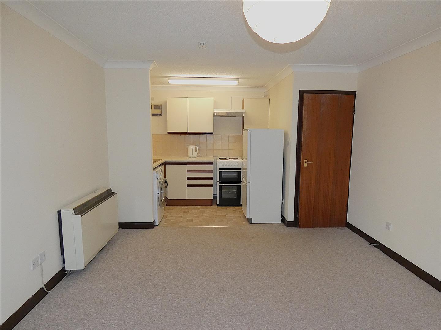 Living room with kitchen area including electric cooker, fridge freezer and washing machine