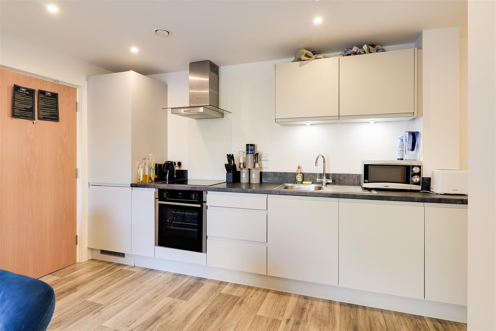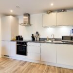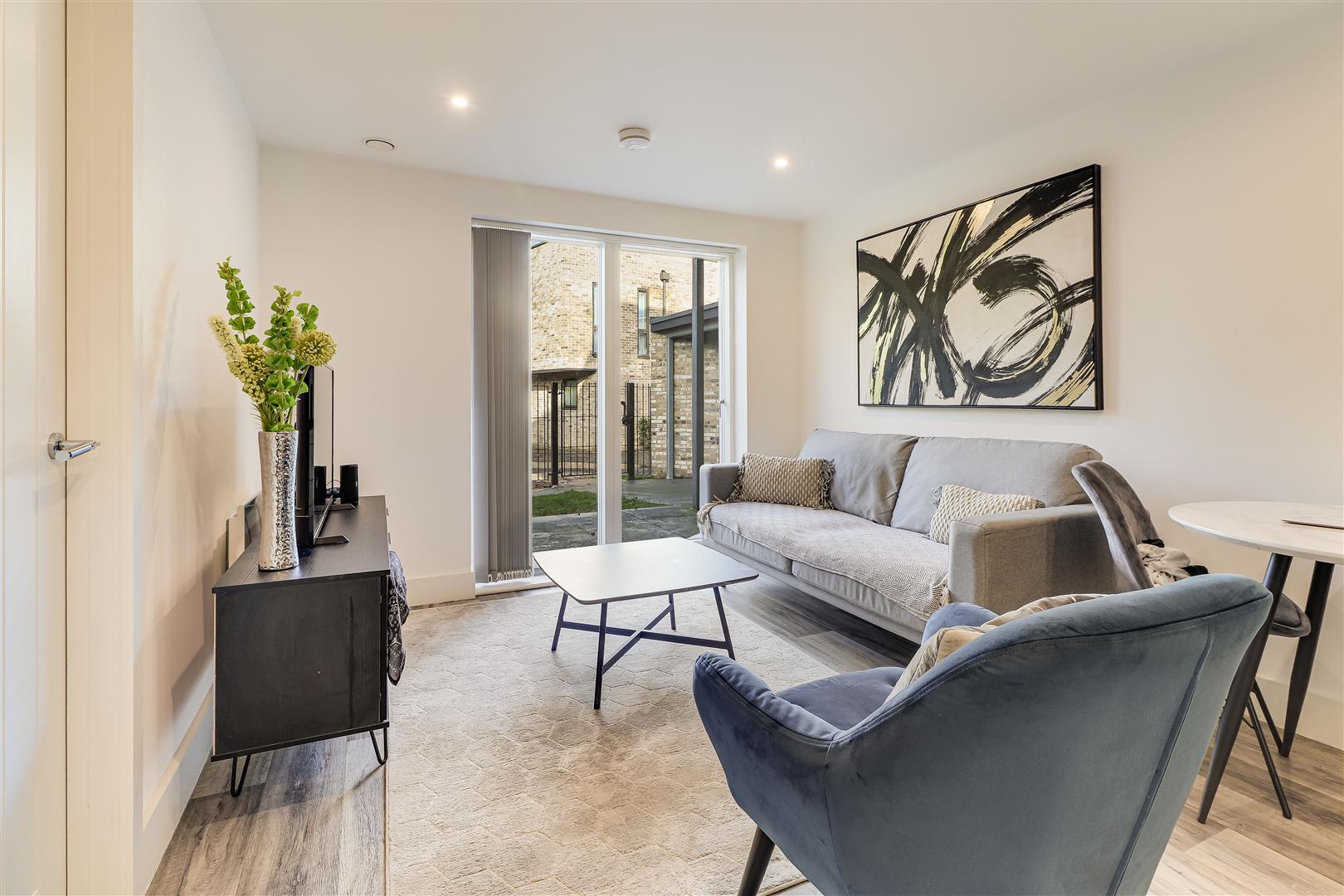 The accommodation consists of an open-plan kitchen/ living/dining room, which is light and airy with patio doors leading to the communal garden. There is a storage cupboard with space and plumbing for appliances. The kitchen has a range of matching cabinets and drawers, ample work surfaces, and integrated appliances include oven, fridge/freezer and dishwasher.