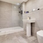 The bathroom has a large walk-in shower, WC, hand wash basin, finished with stylish contemporary tiling.