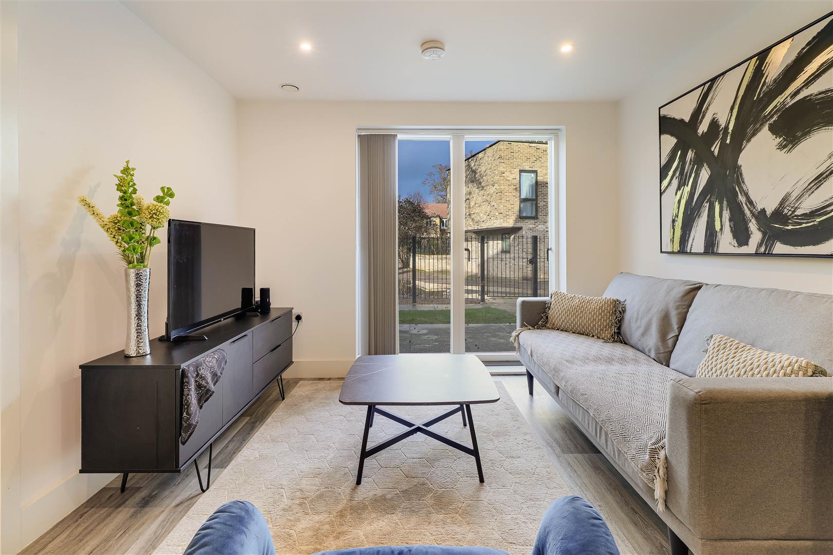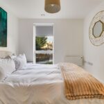 The bedroom is a good-sized double, with floor-to-ceiling windows.