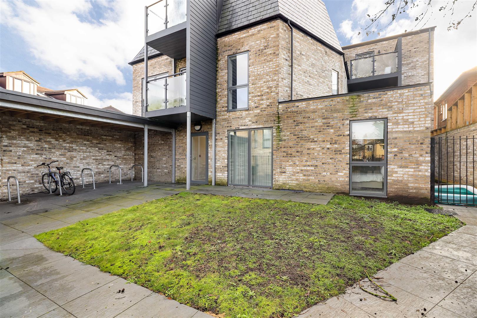 Outside, there are communal gardens and covered bicycle storage.