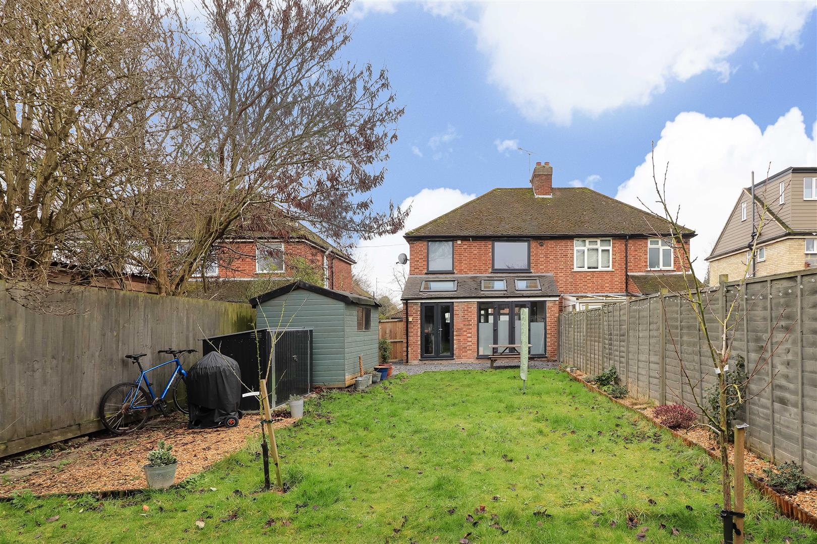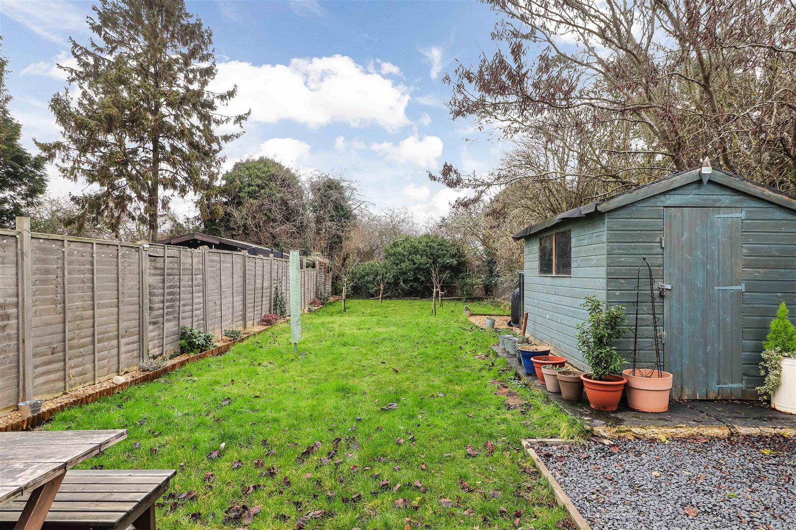 The lovely, private rear garden is laid mainly to lawn with hardstanding areas, borders and a timber shed.