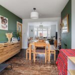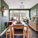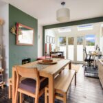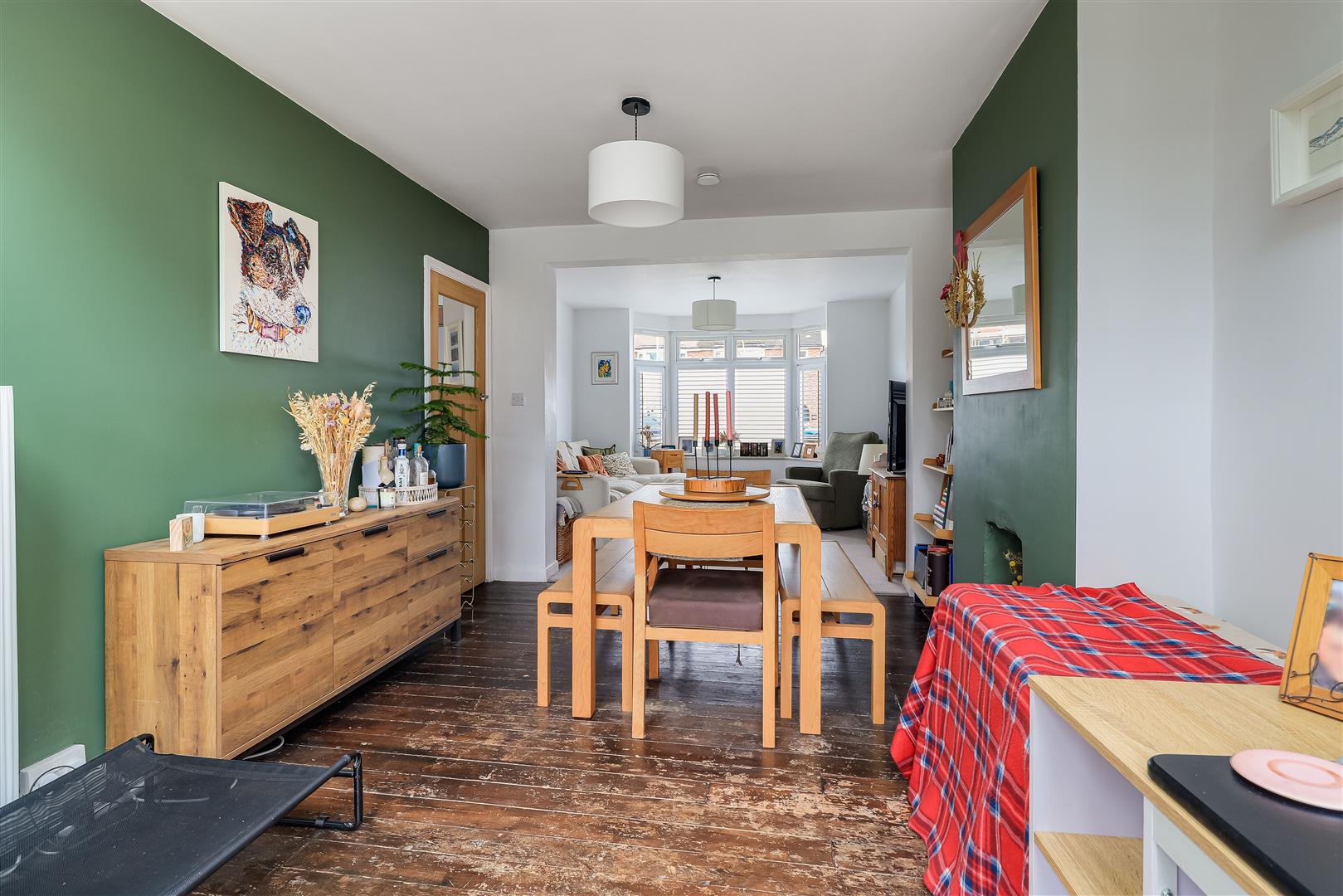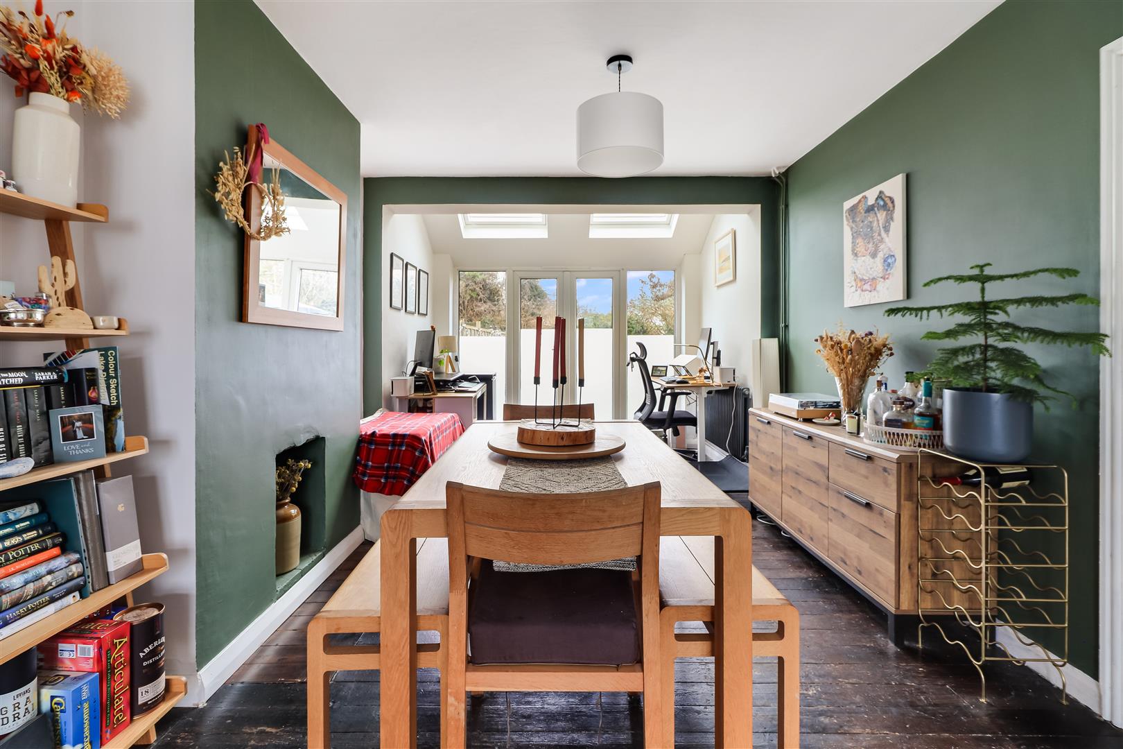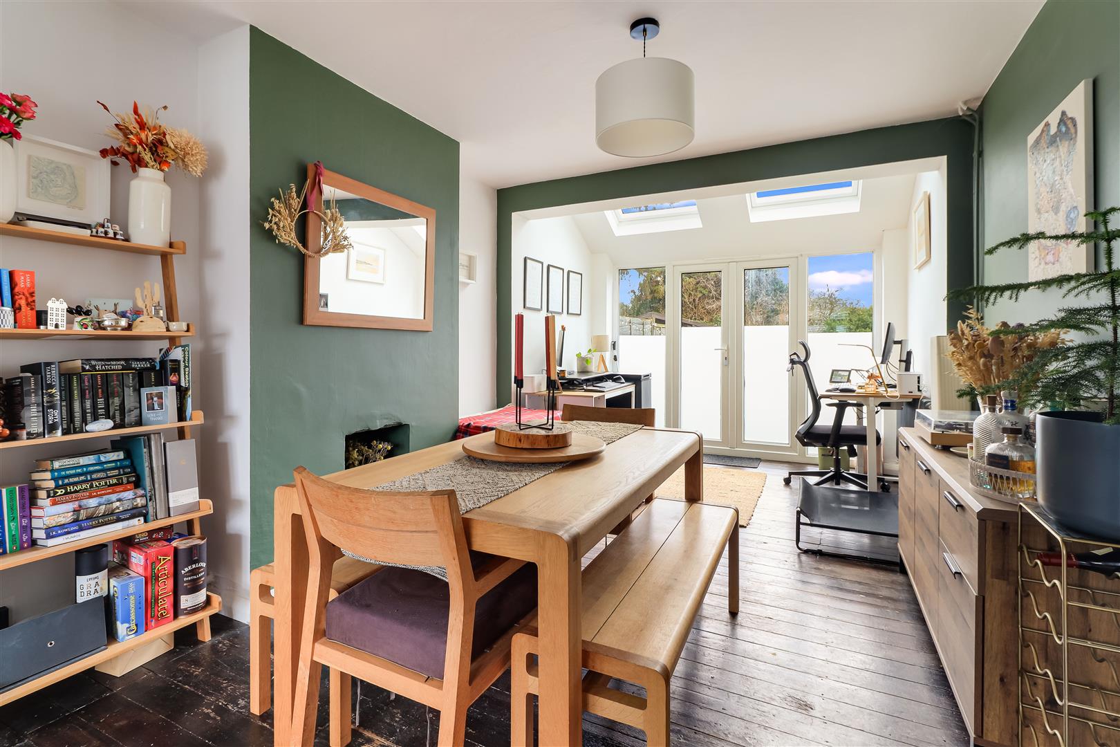 The extended living accommodation offers space and light, running front to back, with bay window as well as rooflights and double doors to the rear. The sitting area is well proportioned and beautifully presented, flowing freely into the dining area which has exposed wooden flooring and a fireplace aperture then into the family area which opens up to the garden.
