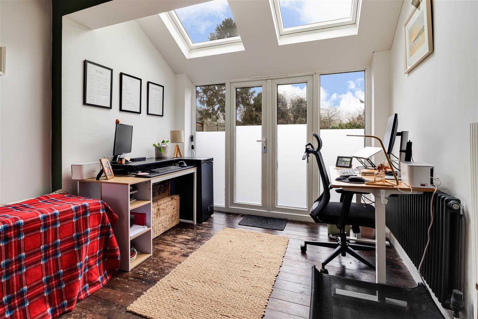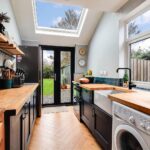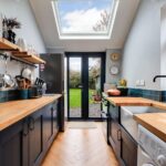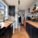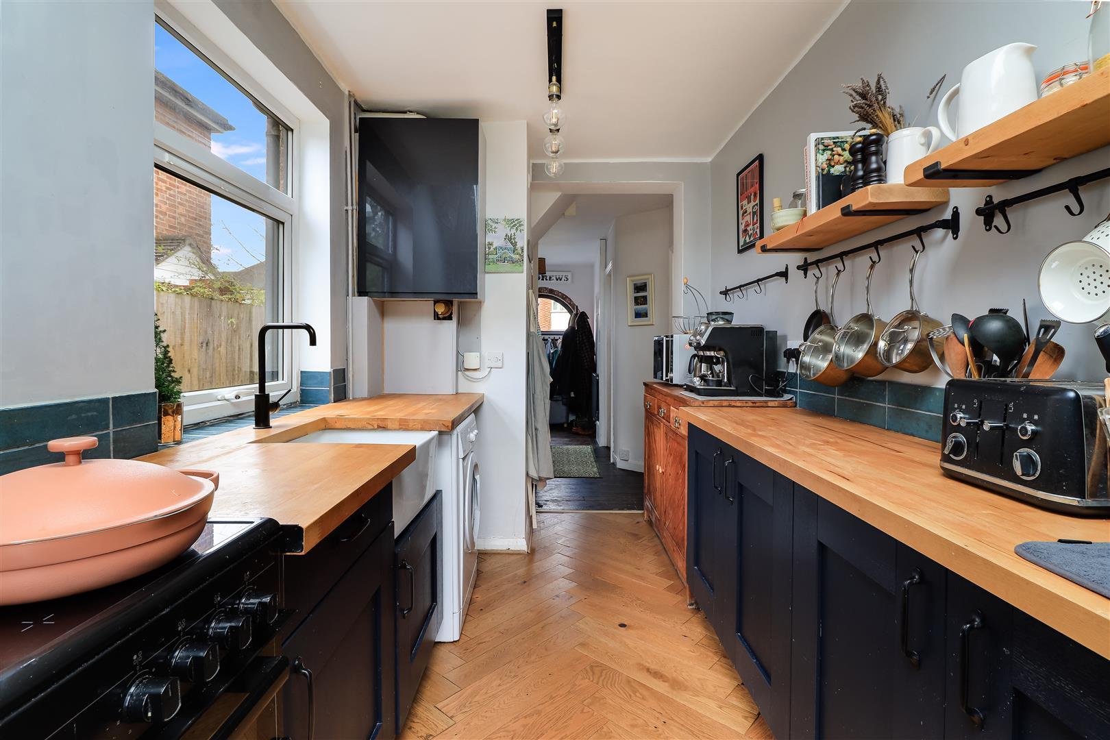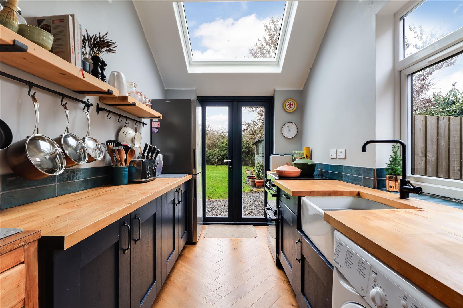 The stylish re-fitted kitchen allows an abundance of natural light via a window, rooflight and double doors which lead to the garden. There is a range of fitted units with timber work surfaces and ceramic butler sink as well as a concealed wall mounted gas fired boiler and herringbone wooden floor.