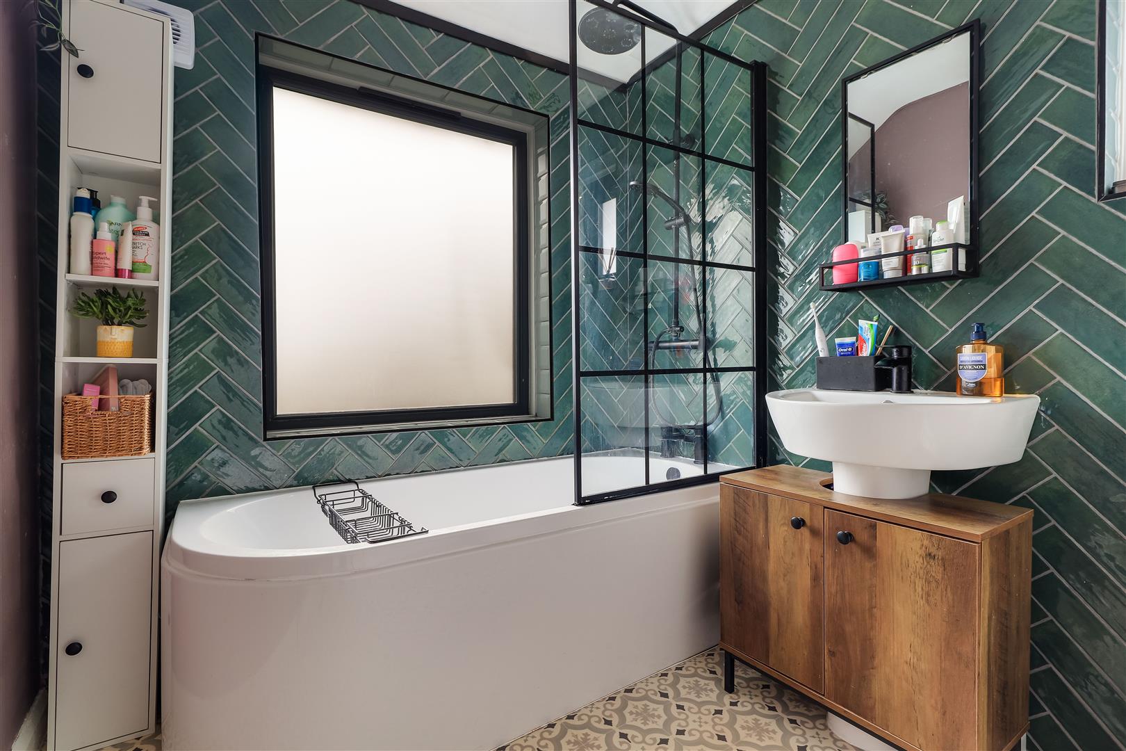 The well appointed three piece re-fitted bathroom comprises a bath with shower over, w.c and wash hand basin in addition to tiled walls, a heated towel rail and two windows.