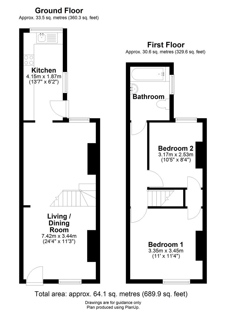 The first floor landing has a loft hatch. Bedroom one is a generous double room, spanning the width of the house, with exposed wooden floor and built in cupboard whilst bedroom two is nicely proportioned with a built in cupboard and quiet rear aspect. The three piece bathroom has a mixer tap shower over the bath as well as a window, part tiled walls, fitted shelving and heated towel rail.