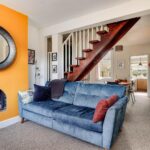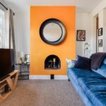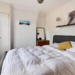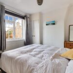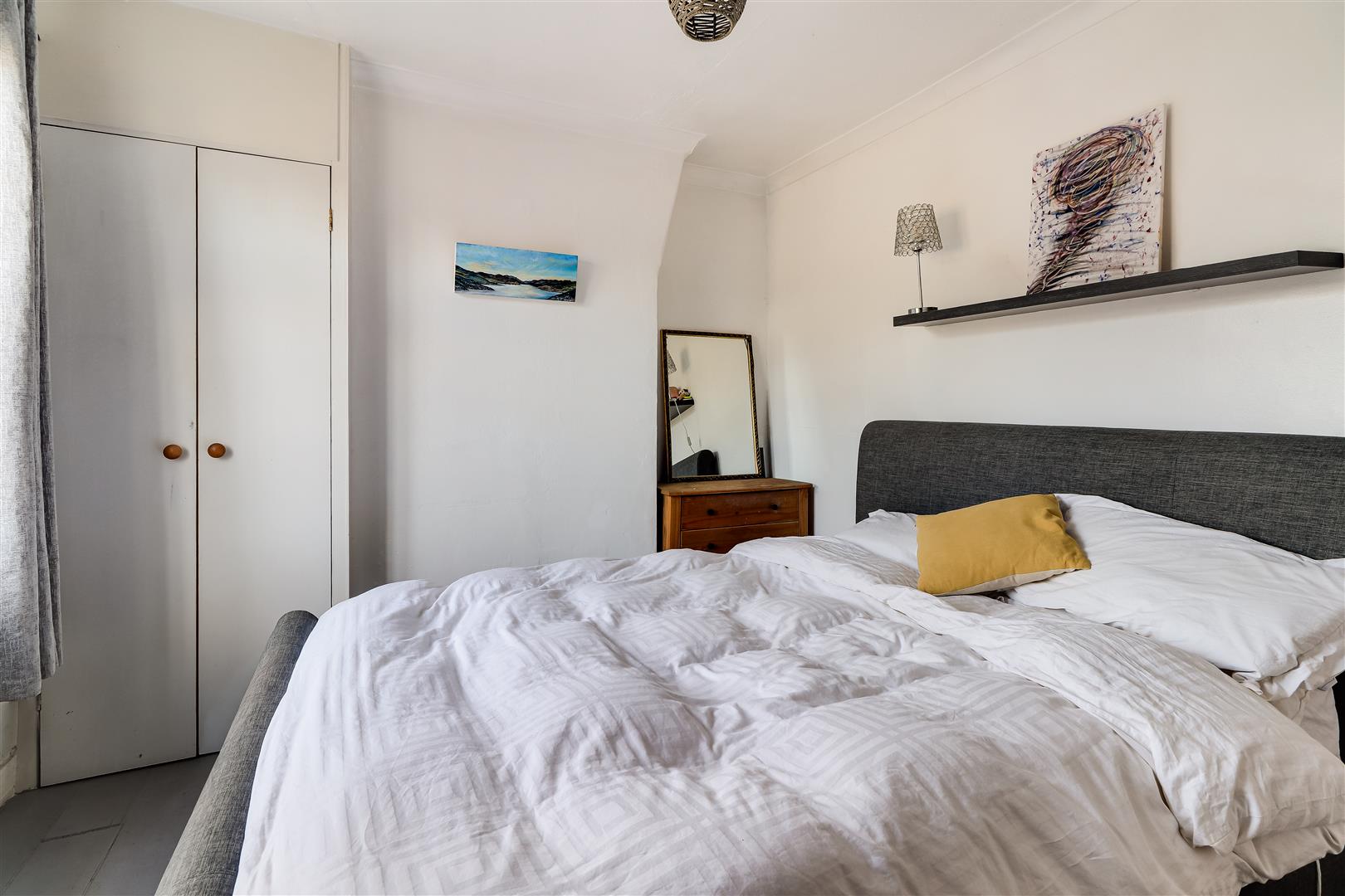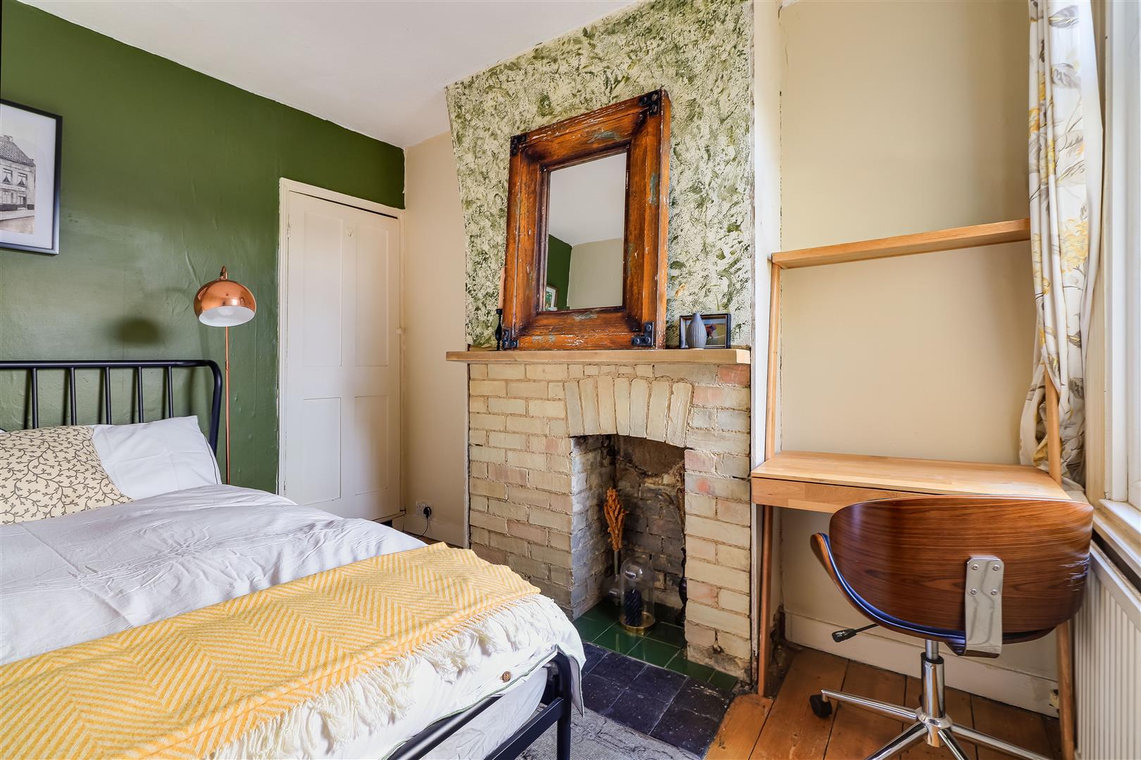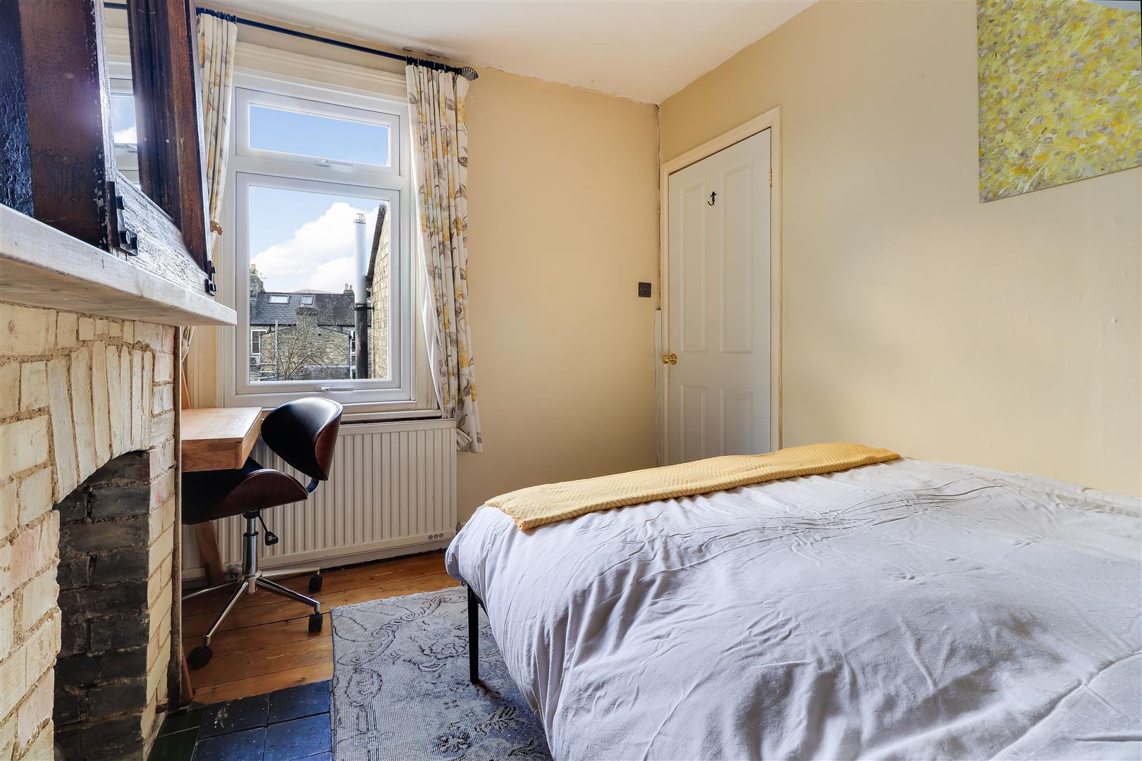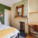 Bedroom two is another comfortable double room, located peacefully at the back, with a double glazed window overlooking the garden, a feature brick fireplace, exposed wooden floor and built in cupboard.