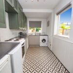 Rear kitchen with microwave, under counter fridge and freezer, electric oven and washing machine.