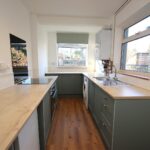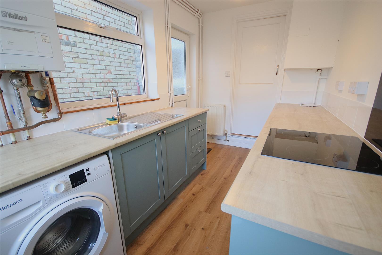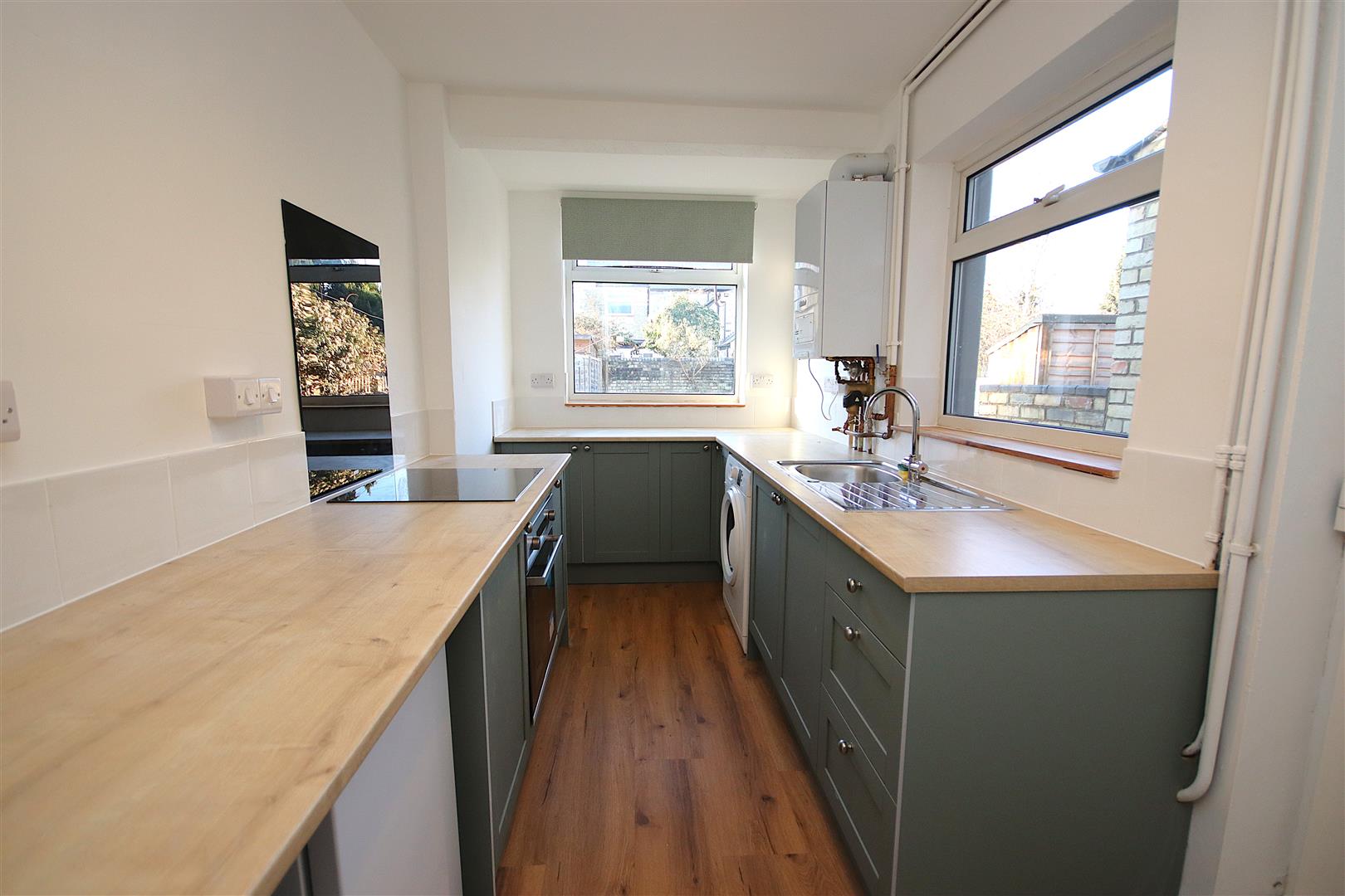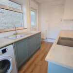Kitchen is equipped with electric hob and oven, under counter fridge and washing machine