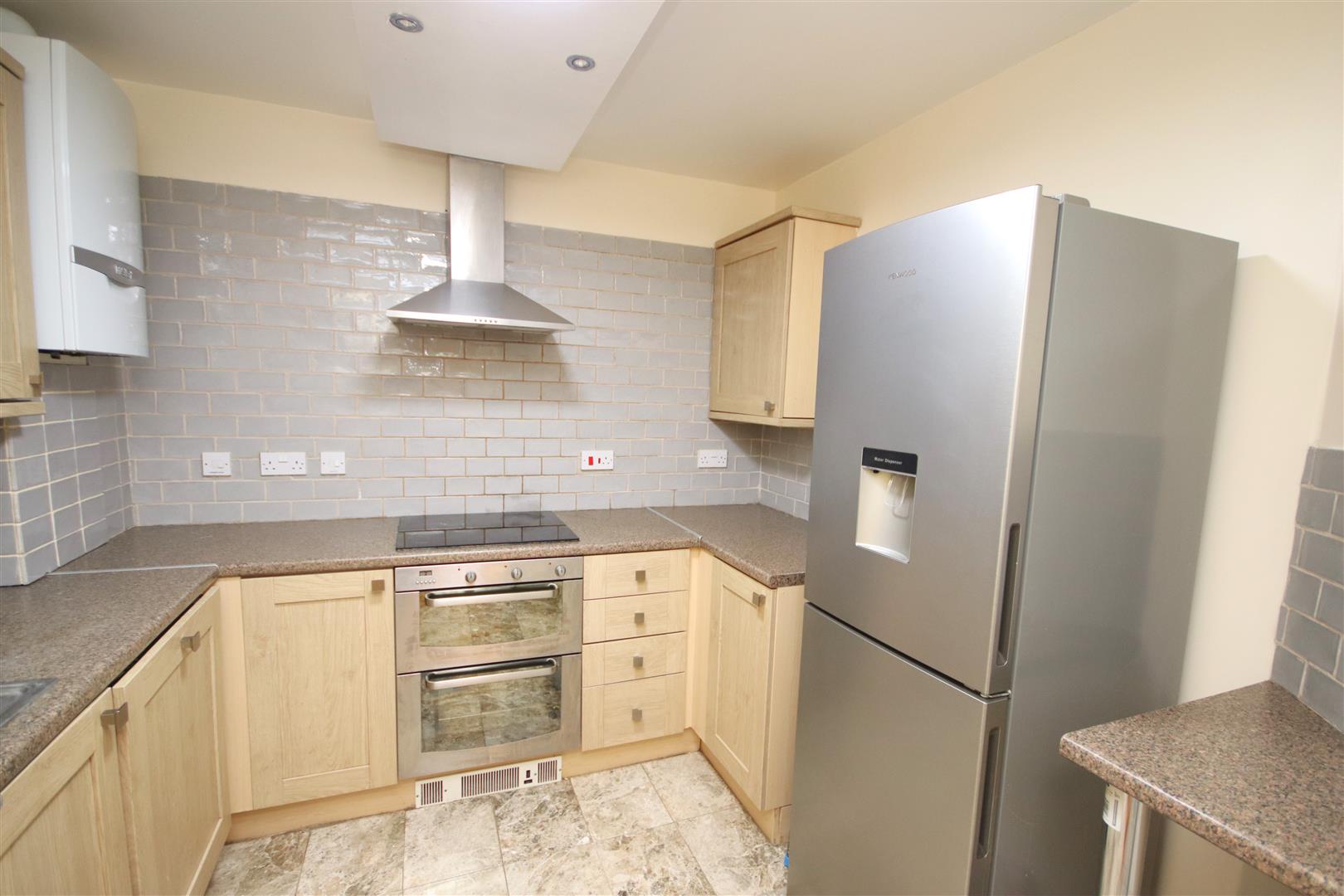 Modern kitchen equipped with electric induction hob, electric oven, fridge-freezer, dishwasher and washing machine