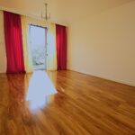Spacious living room with wood flooring and patio door leading to a private courtyard garden