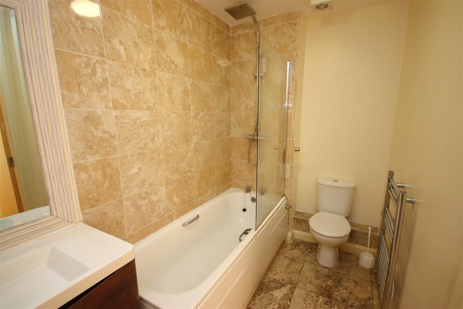 Bathroom with shower over the bath, WC, heated towel rail and large sink with vanity unit