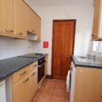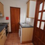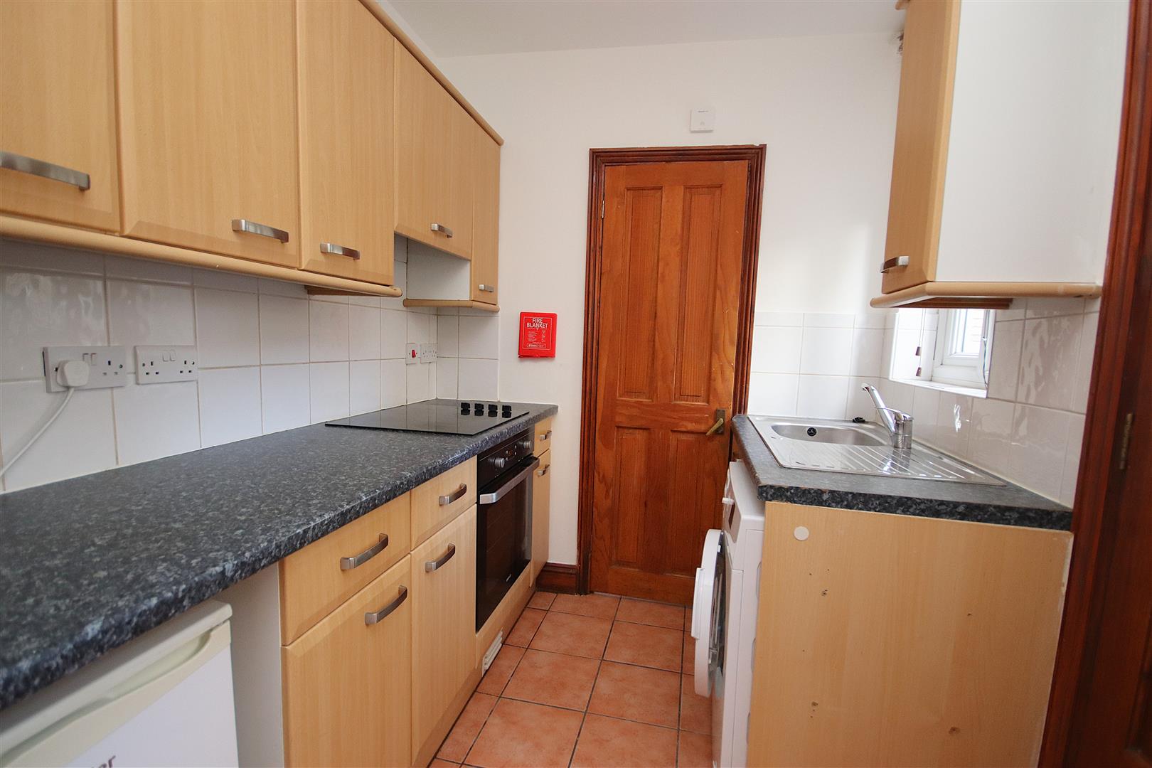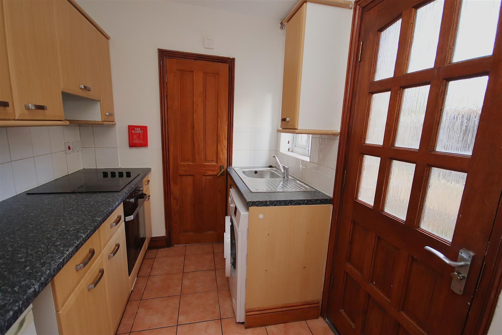 Rear kitchen with back door. Kitchen is equipped with electric hob and oven, under counter fridge and washing machine