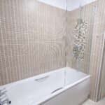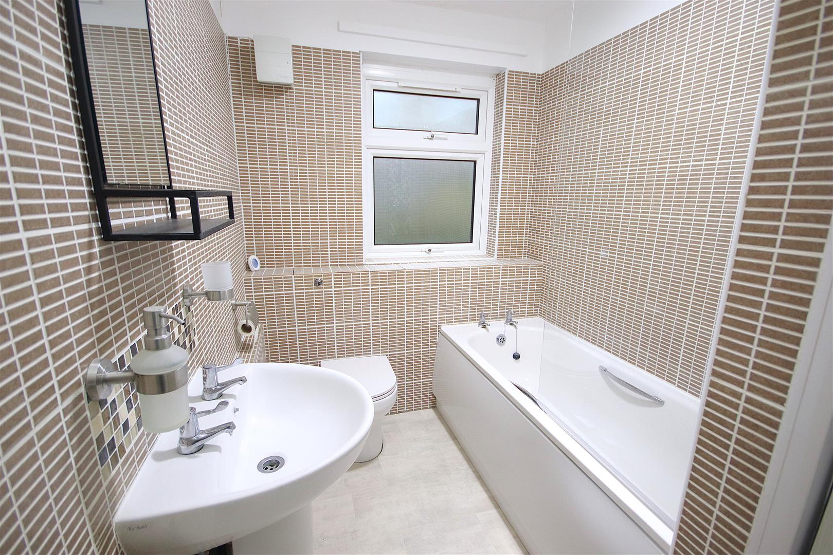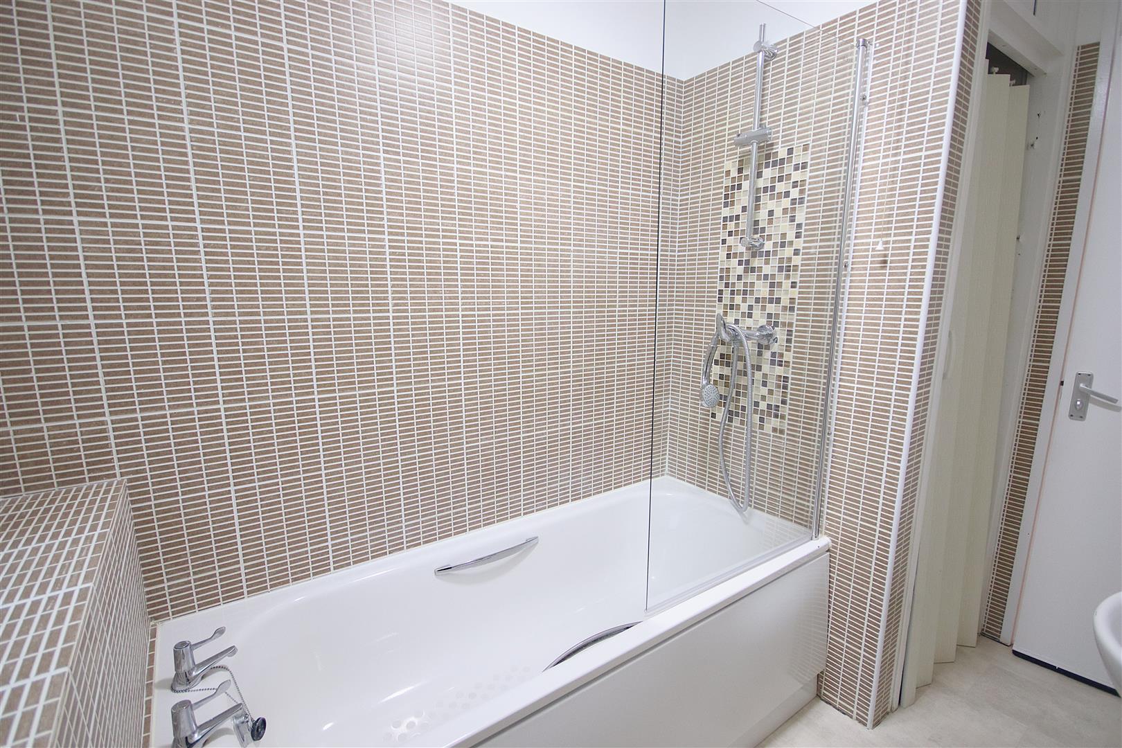 Fully tiled bathroom with shower over bath, WC, hand basin and cupboard