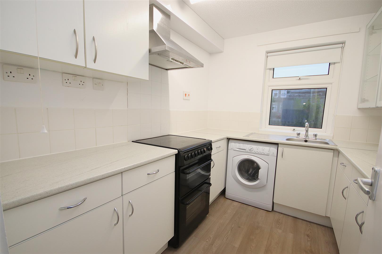 Rear fitted kitchen with electric cooker and extractor hood, washing machine and freestanding fridge freezer