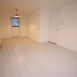 Spacious living/dining room with wood laminate flooring and back door leading to small enclosed garden
