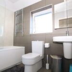 Modern family bathroom located on the first floor with shower over the bath, WC, hand basin and heated towel rail