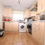 Rear fitted kitchen with gas hob, electric oven, washing machine, fridge-freezer and dishwasher