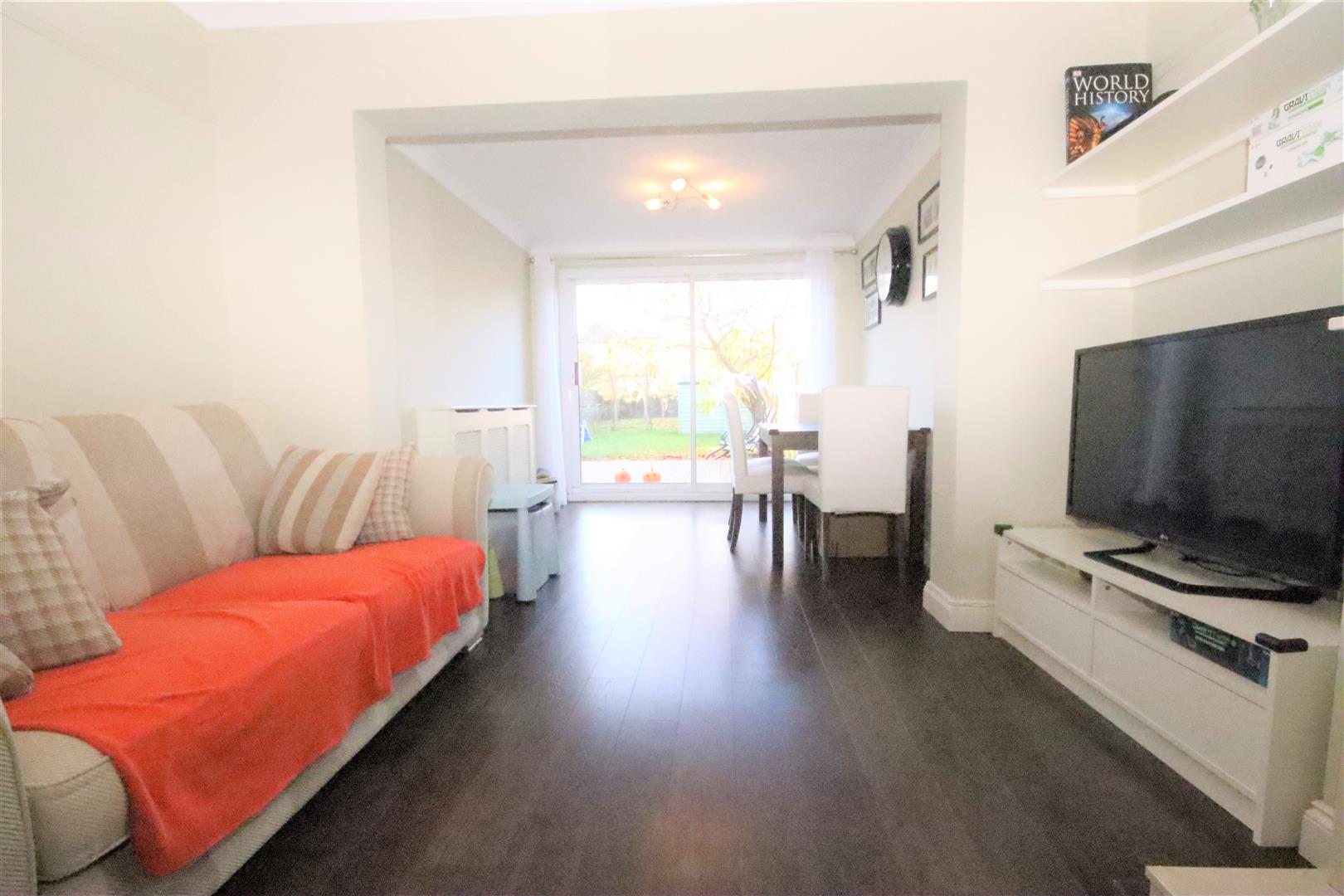 Rear extended living room with laminate flooring and patio doors to large garden