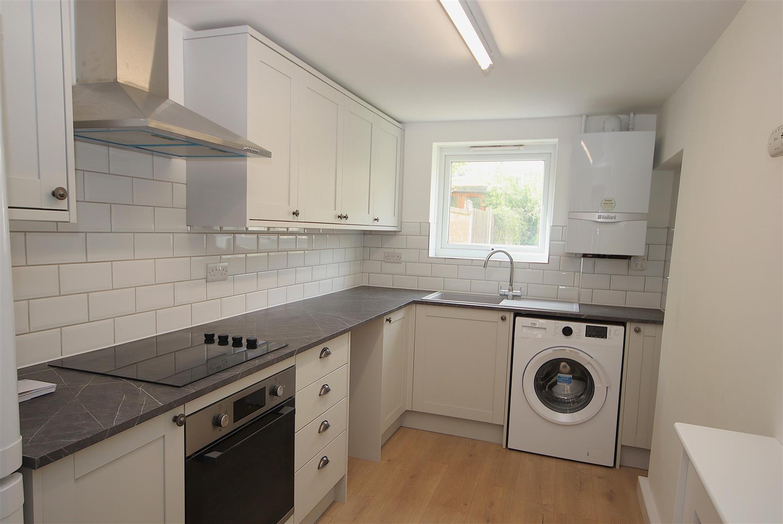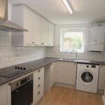 Rear modern kitchen with electric hob and oven with extractor hood, fridge freezer, washing machine and plumbing for slimline dishwasher (not supplied)