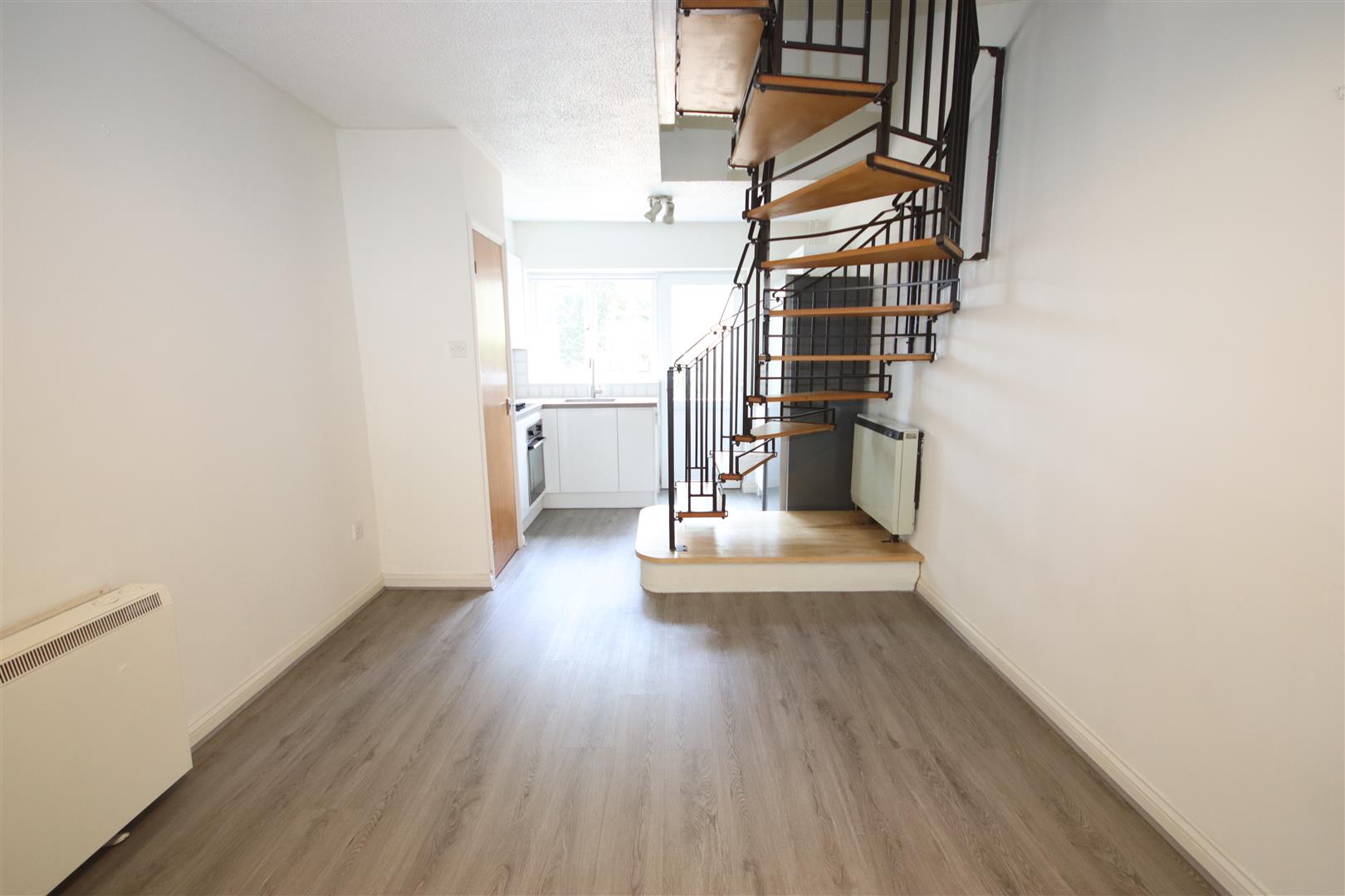 Open plan living room/kitchen with wood laminate flooring and spiral staircase leading to first floor. The modern kitchen comes with electric hob and oven, washer-drier and fridge-freezer