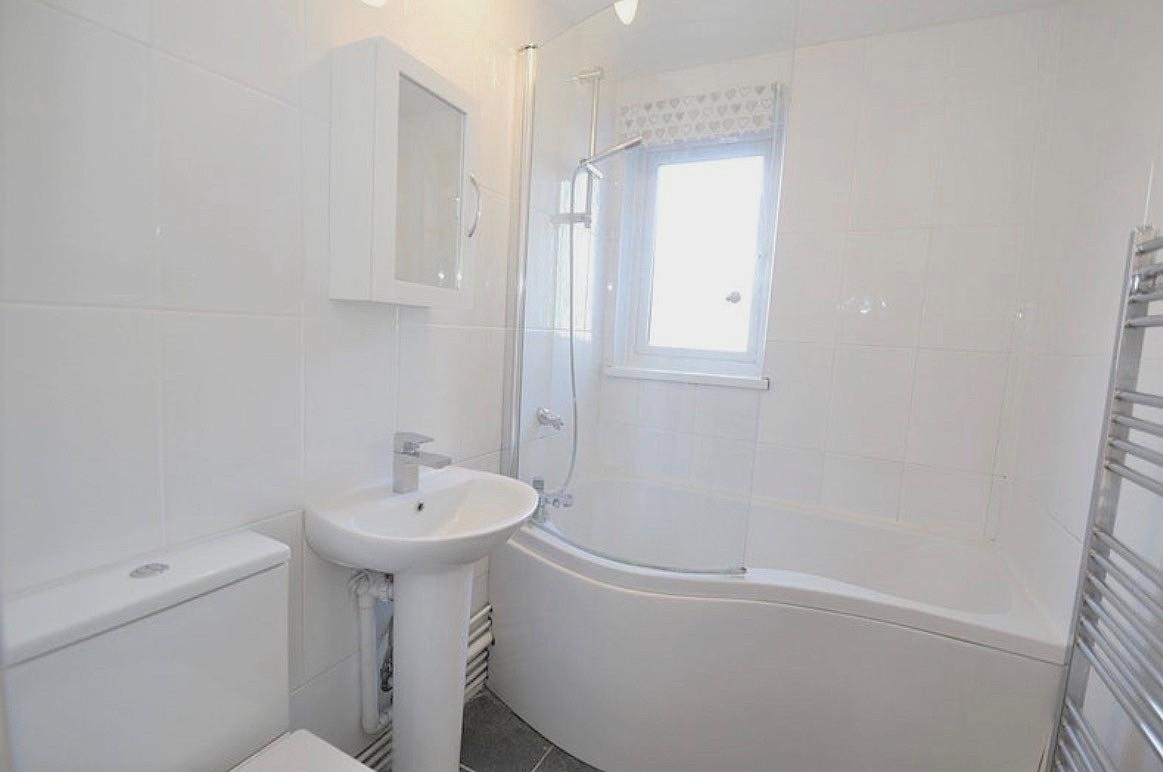 Modern fitted bathroom with shower over bath, WC, hand basin and heated towel rail