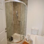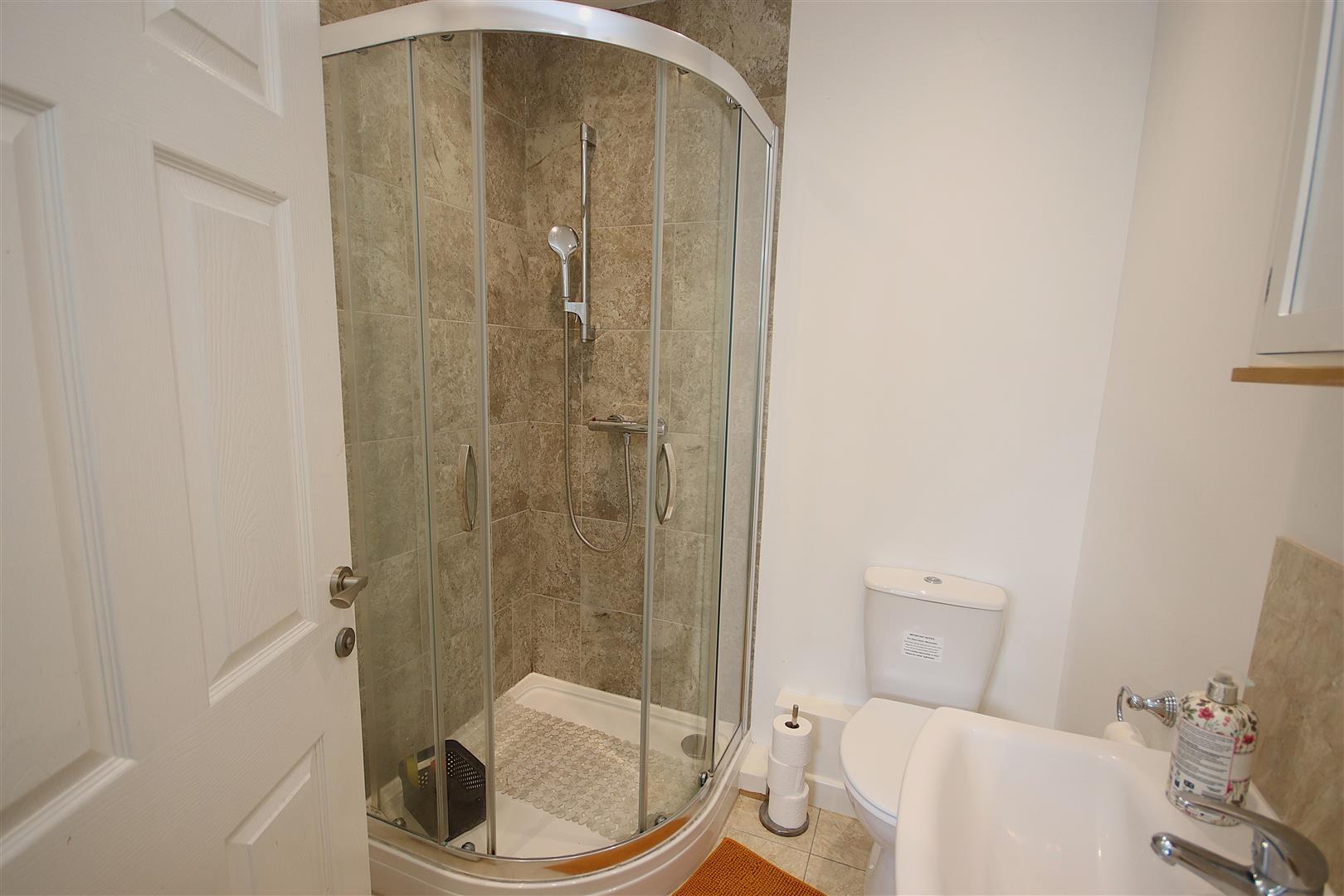 Shower room with spacious shower enclosure, WC, hand basin with storage, storage cupboard and heated towel rail
