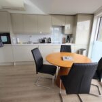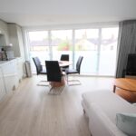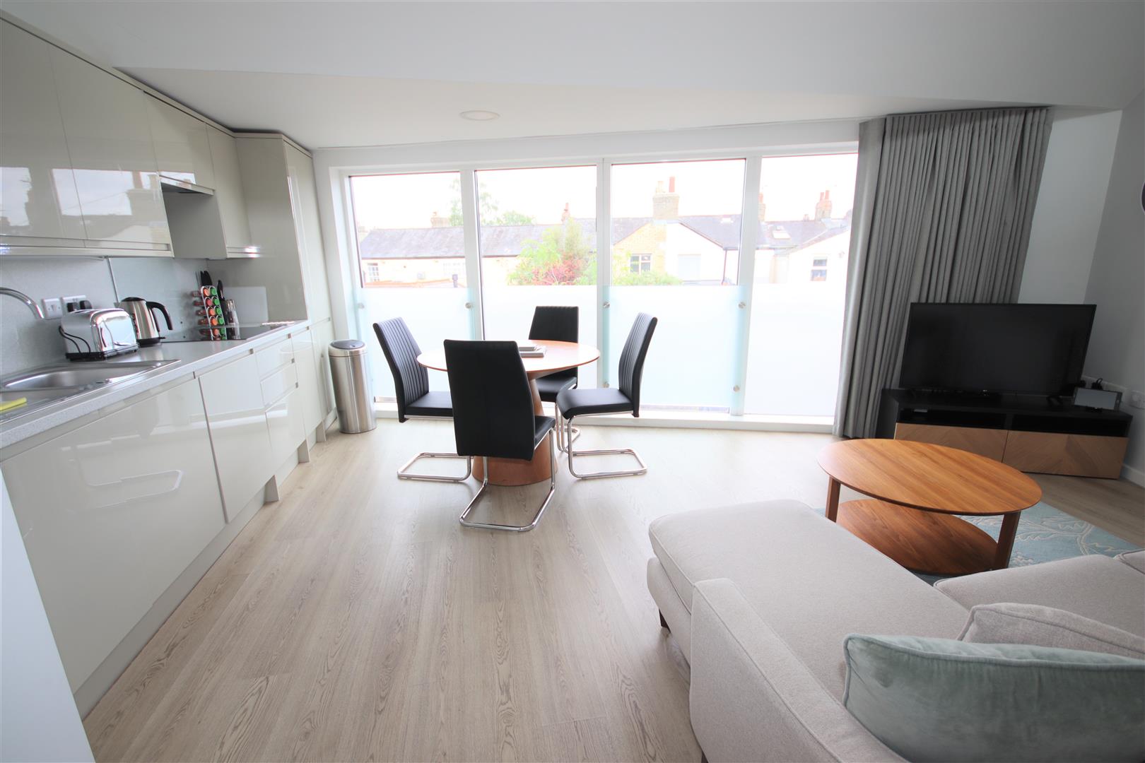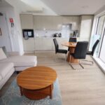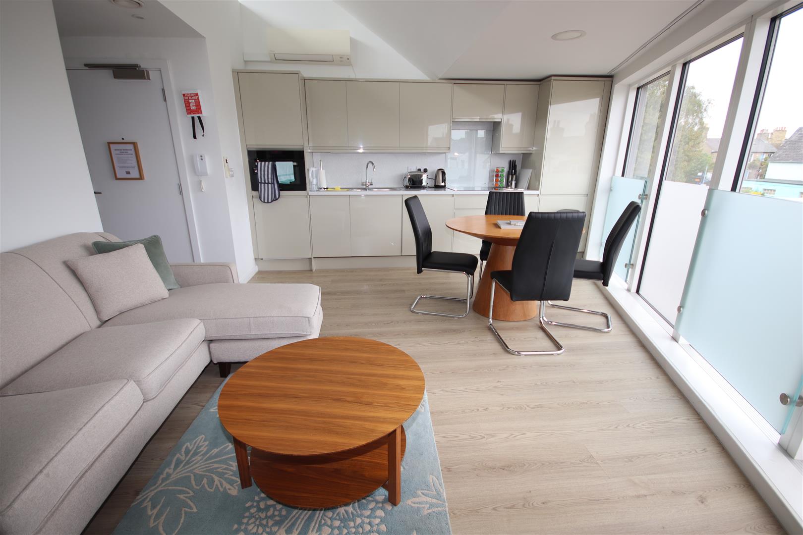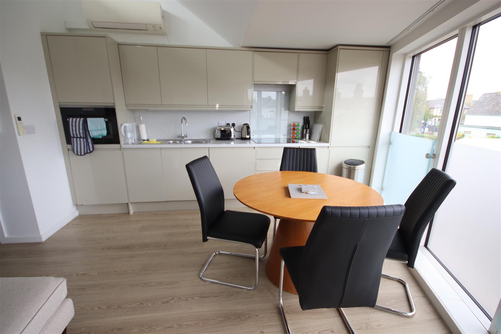 Bright living room with picture windows and fully fitted kitchen with electric hob, microwave grill , fridge, washer-drier and dishwasher,
