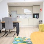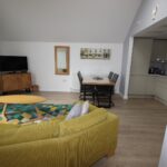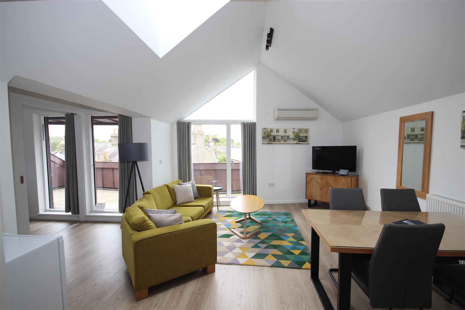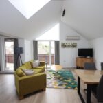 Bright living room with vaulted ceiling and fully fitted kitchen area with electric hob, oven/microwave, fridge, washer-drier and dishwasher,