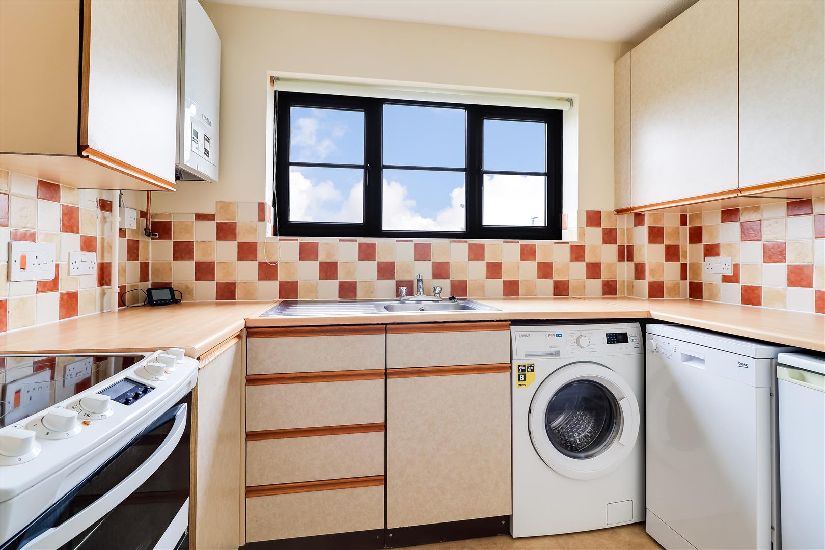 The fitted kitchen comprises a range of wall and base units and work surfaces with a stainless steel sink and drainer, wall mounted gas fired boiler, gas and electric cooker points, plumbing for washing and space for a fridge and freezer.
