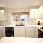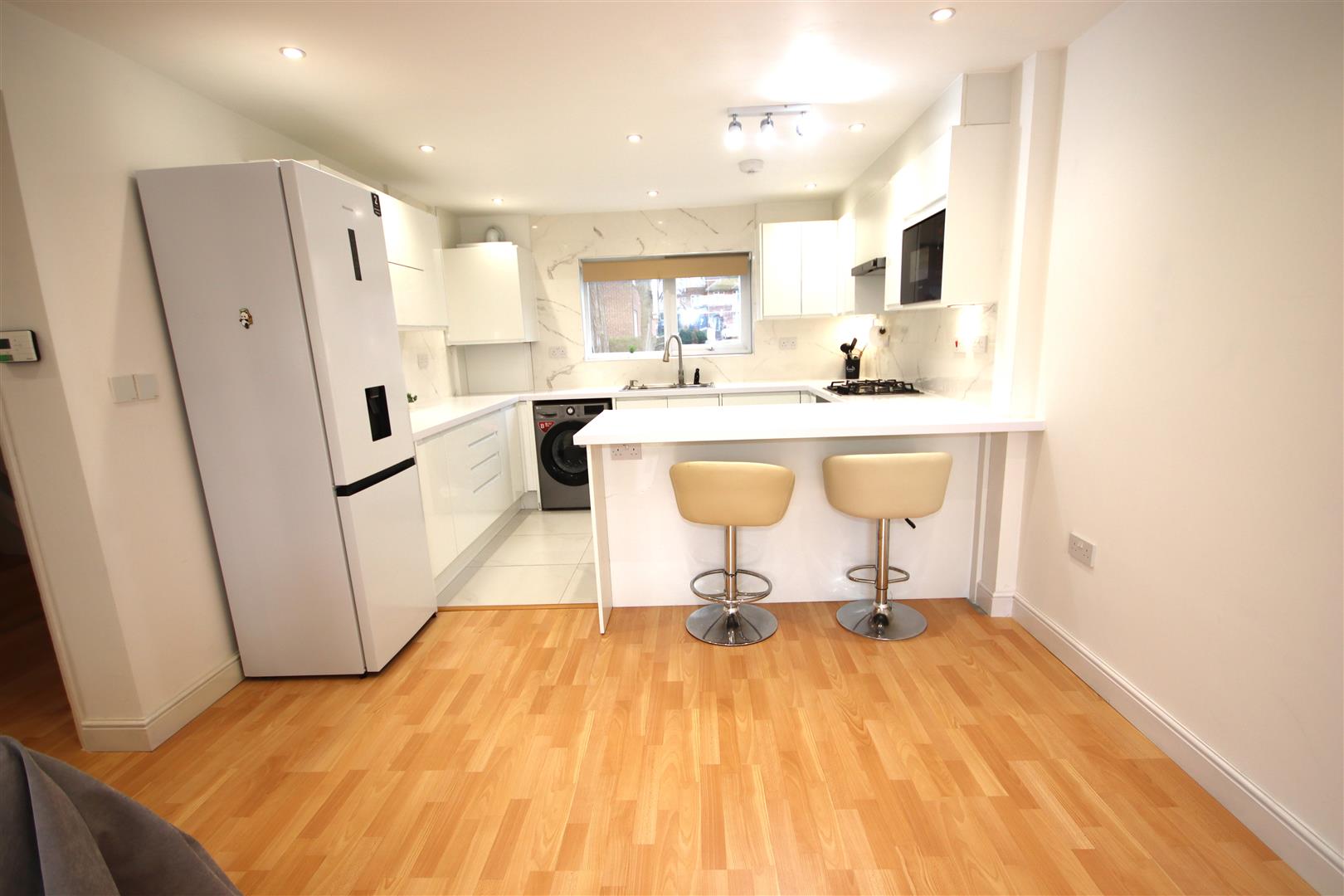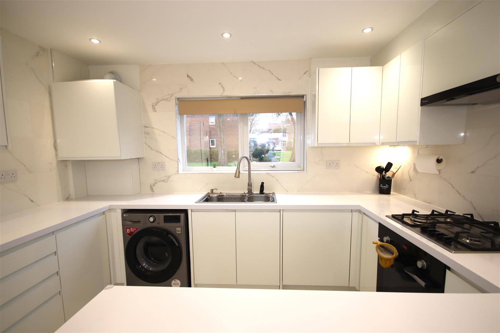 Very smartly fitted kitchen opening to the living room. The kitchen is fitted with gas hob and electric oven, integrated microwave, washing machine, dishwasher and fridge-freezer