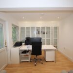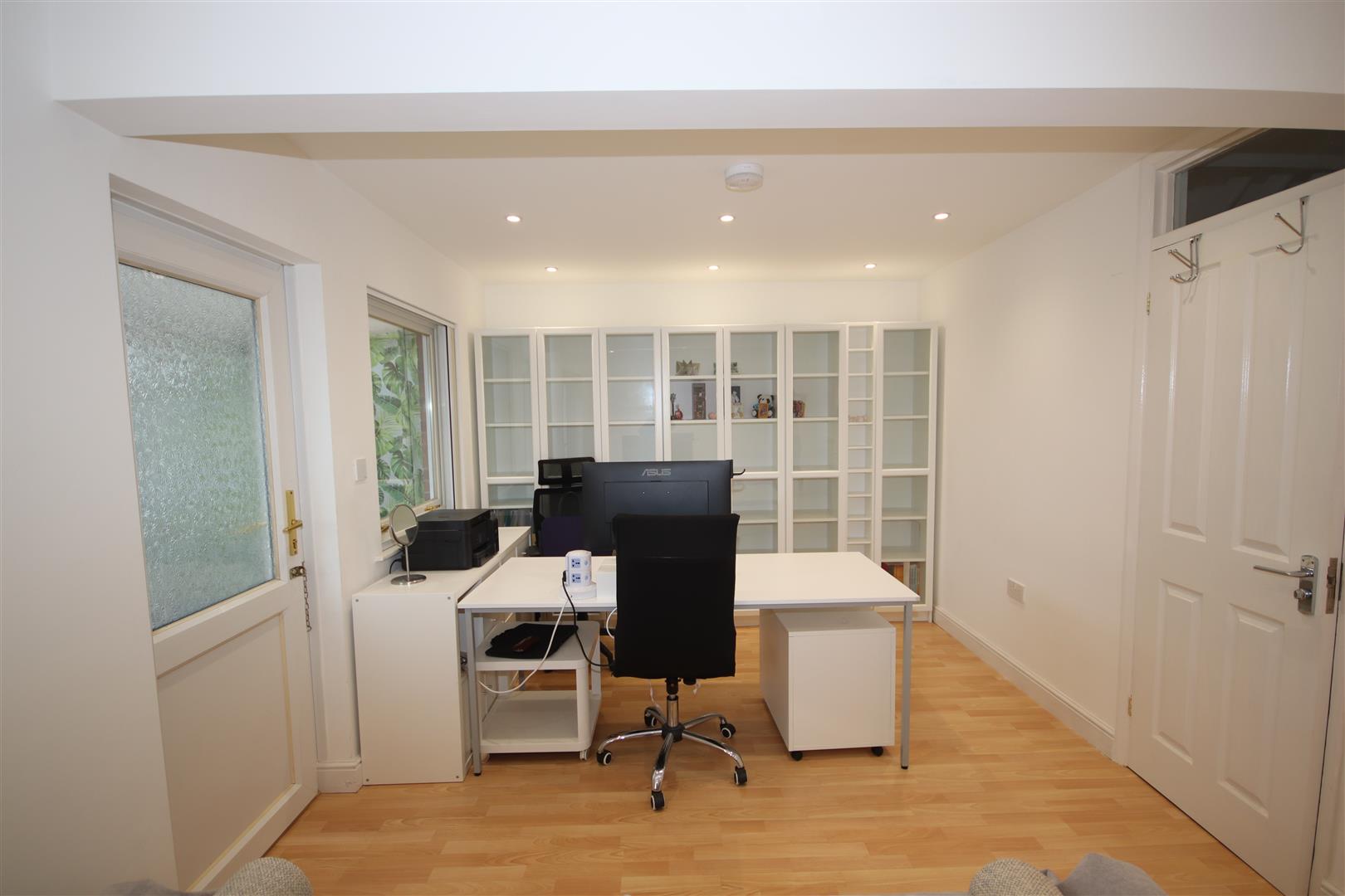 Sleek modern living room with wood laminate flooring, door to conservatory and French doors to the garden with wall mounted storage unit, sofa and desk, filing cabinet and cupboard