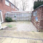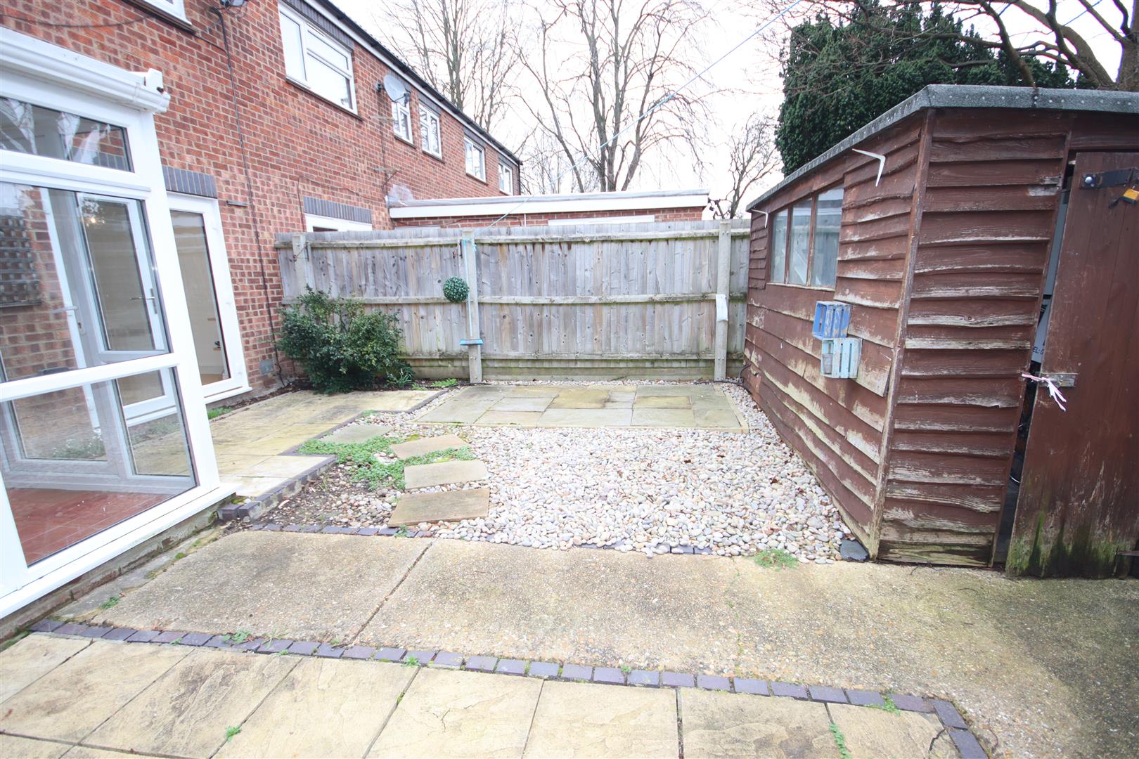 Enclosed paved rear garden with rear access gate and wooden shed