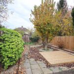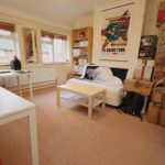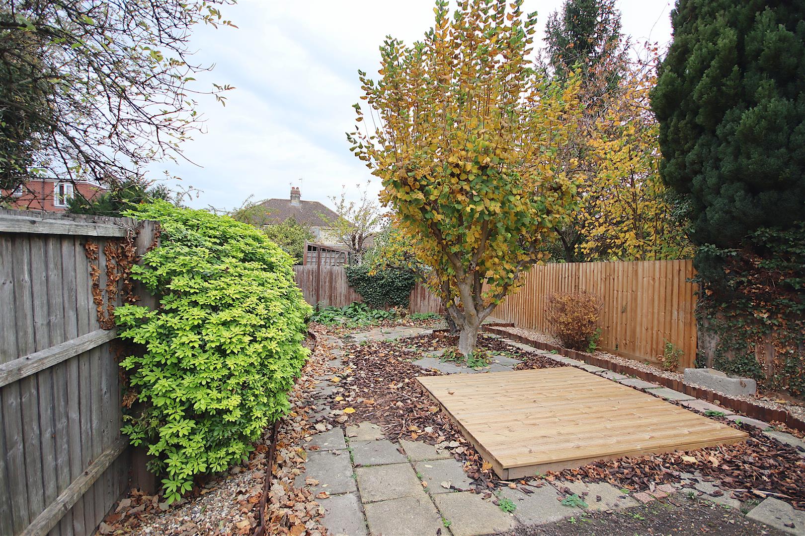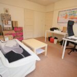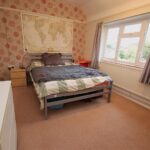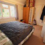 Rear double bedroom with bed frame (no mattress), side table and chest of drawers
