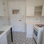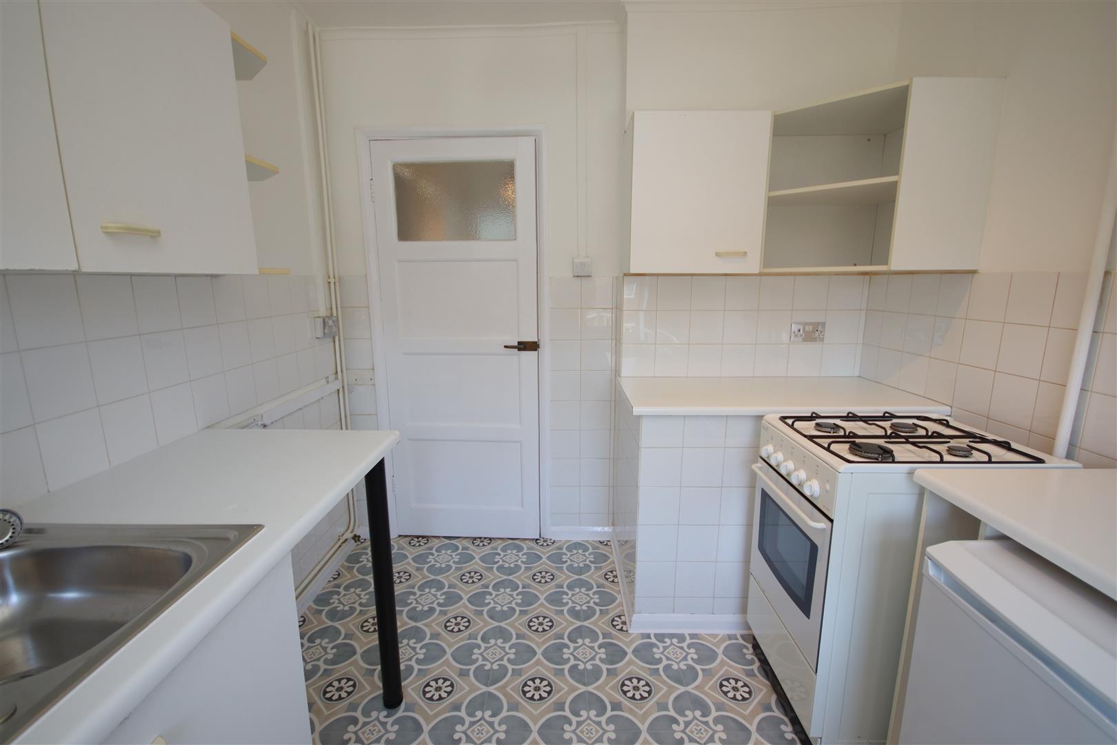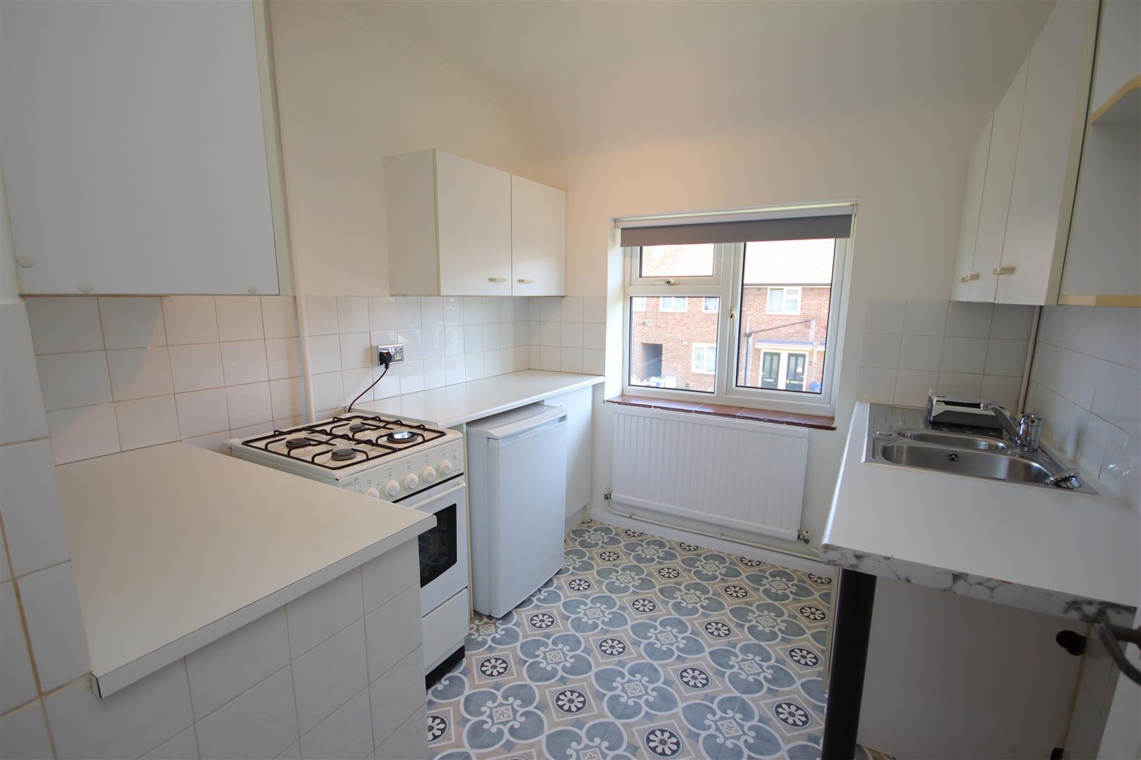 Front fitted kitchen with gas cooker and under counter fridge