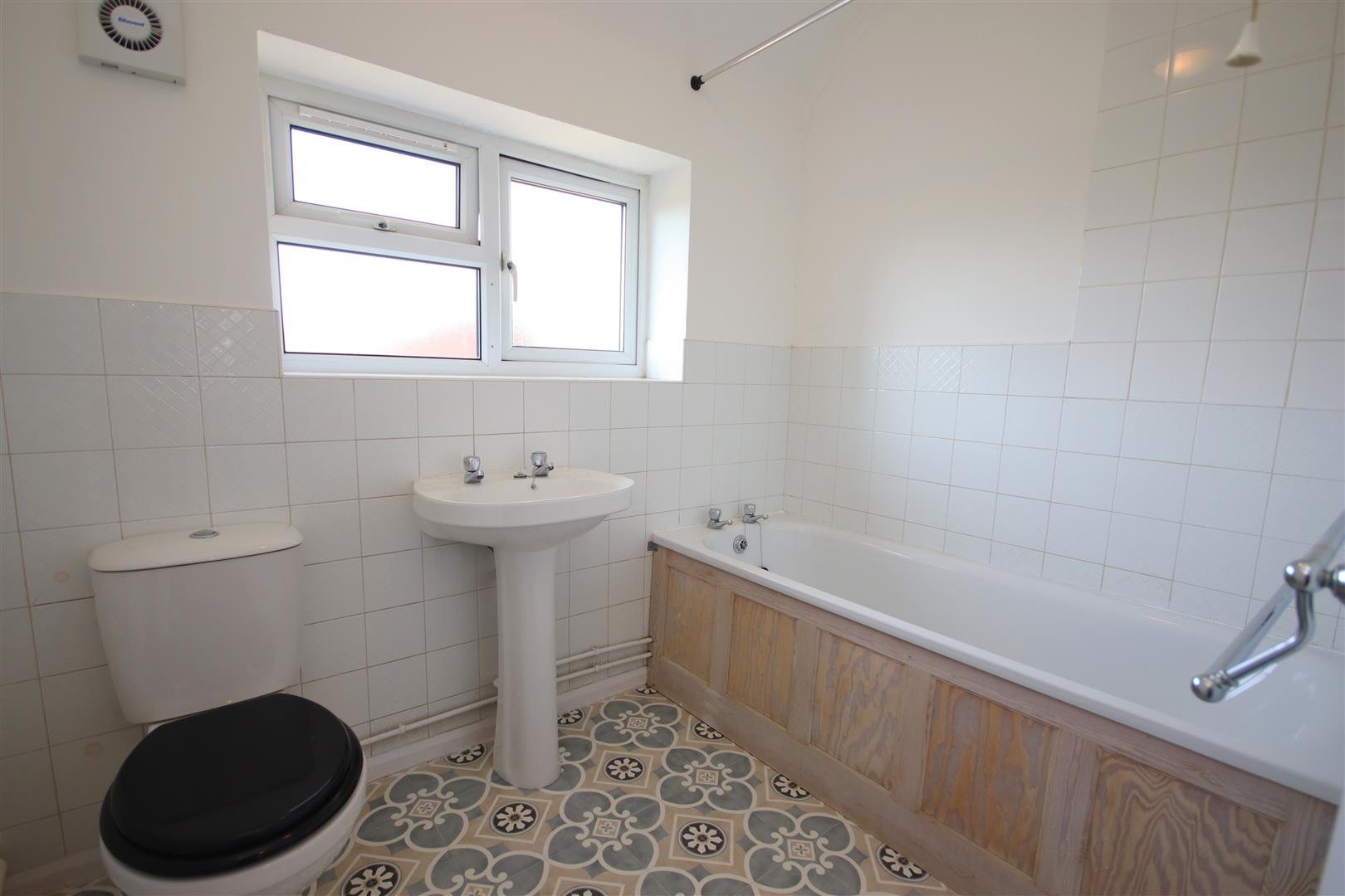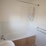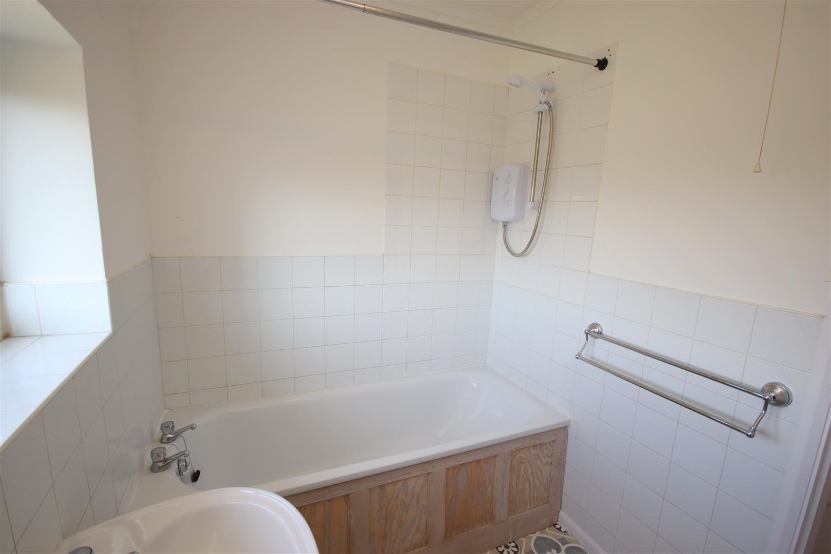 Bathroom with electric shower over bath, extractor fan, WC and hand basin