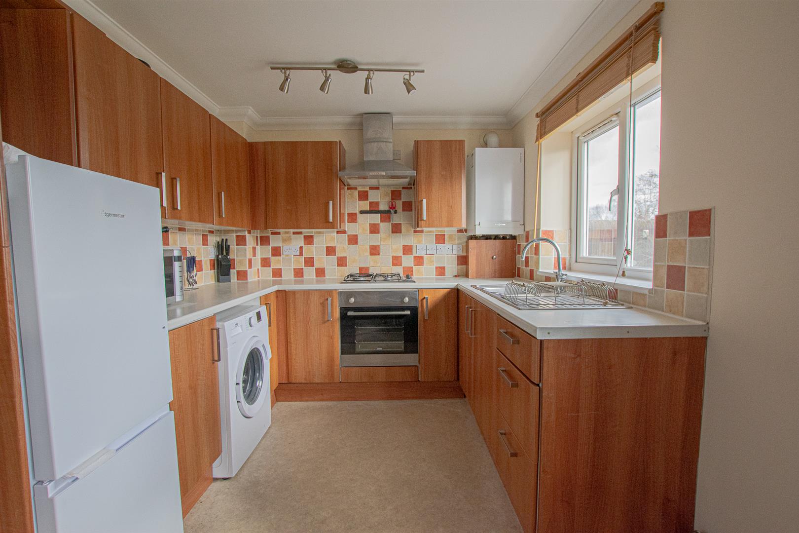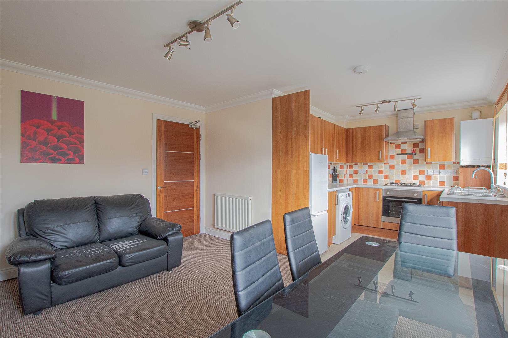 Open plan kitchen/living room located on the first floor. The kitchen is equipped with gas hob and electric oven with extractor hood, fridge-freezer and washing machine