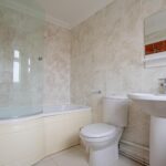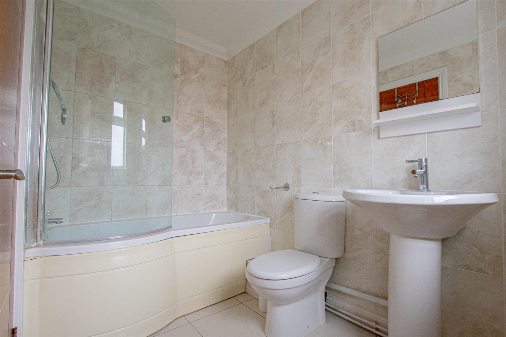 First floor bathroom with shower over bath, WC and hand basin