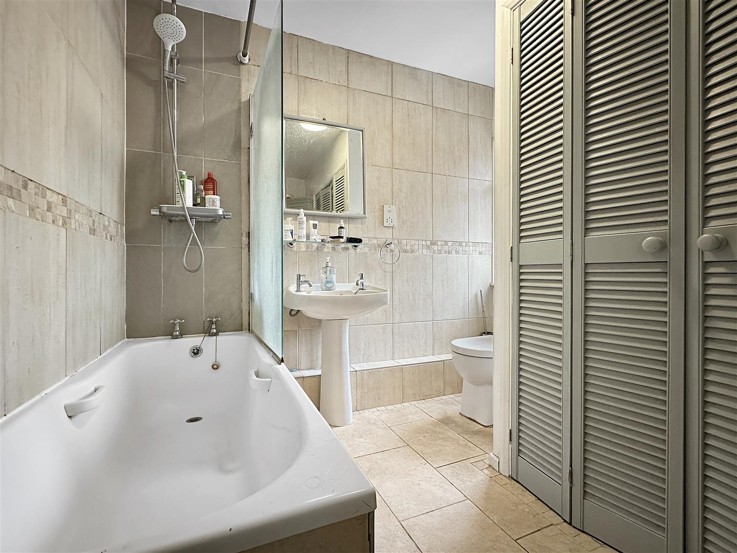 The contemporary bathroom provides a bath with shower over, basin, WC and finished with floor to ceiling tiling. Cupboards discreetly house the recently replaced combi boiler and the washer-dryer.