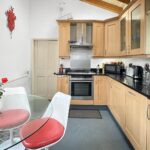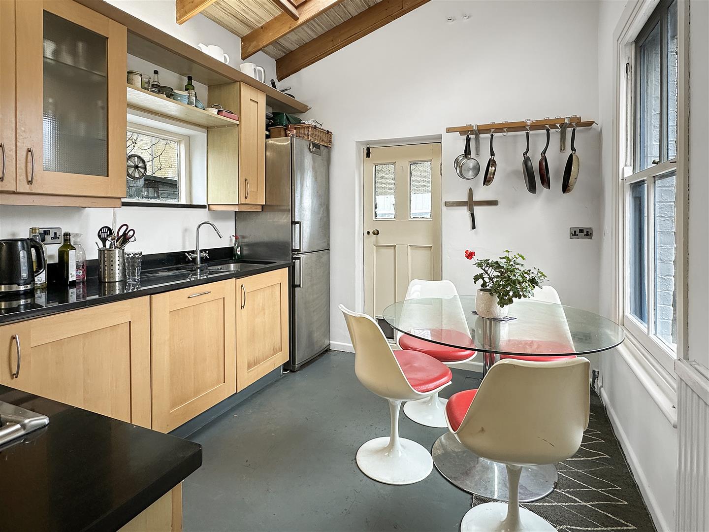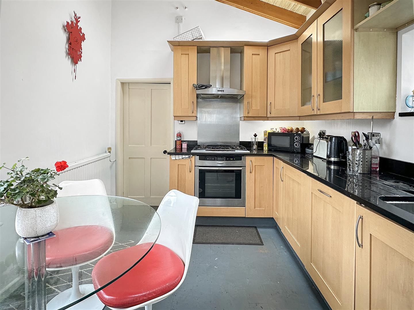 The modern kitchen/dining room has a vaulted ceiling with dual aspect windows, plus 2 Velux windows providing lots of natural light. Fitted kitchen with granite worktop; integrated oven; 4 ring gas hob with extractor above and integrated dishwasher. A part glazed door gives access to the garden.
