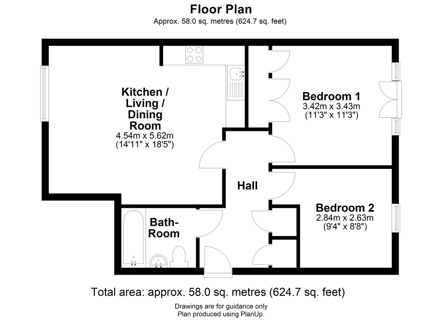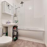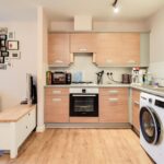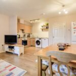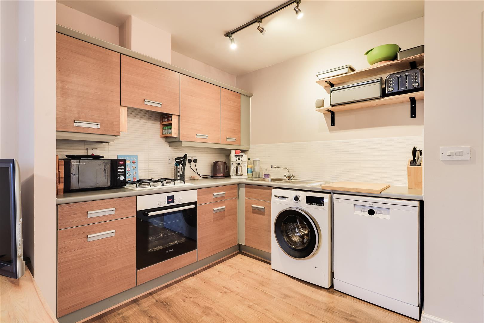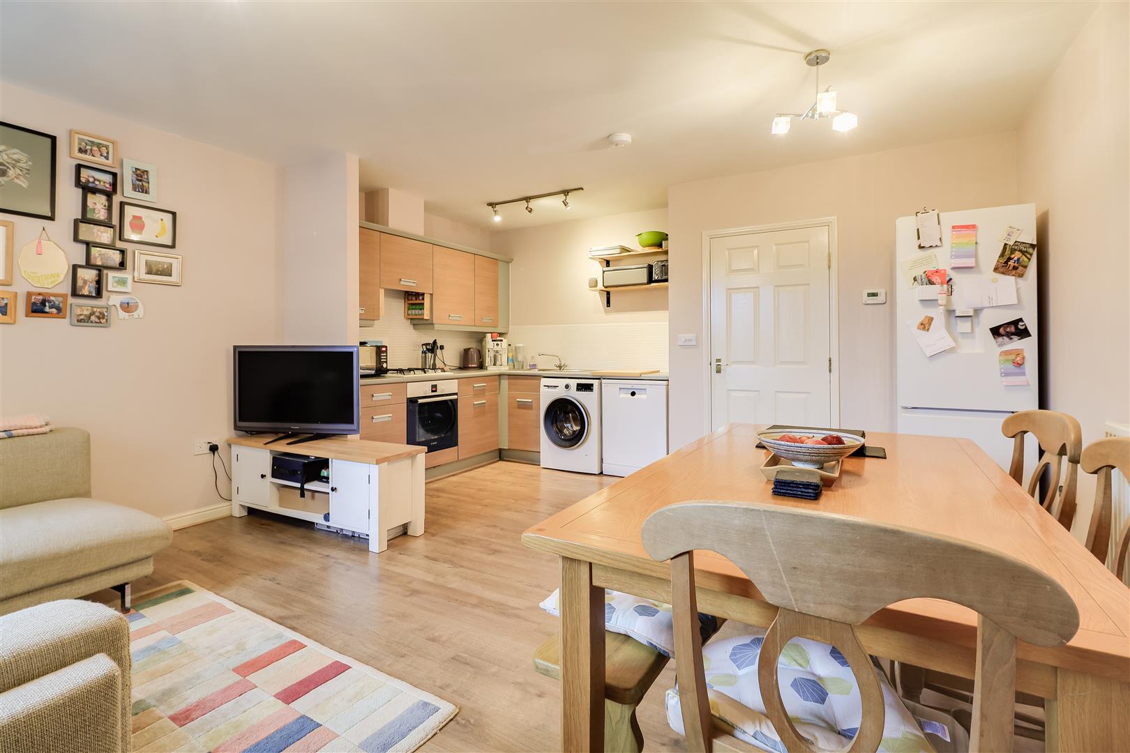 The open plan sitting/dining/kitchen provides spacious and modern living space with a window overlooking the grounds and wood effect flooring. The fitted kitchen area comprises a range of wall and base units with work surfaces, an integrated electric oven and hob with extractor over and plumbing for both washing machine and dishwasher.