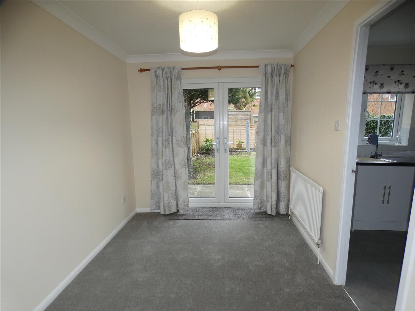 Spacious open plan living room with cupboard and French Doors leading to rear garden
