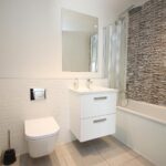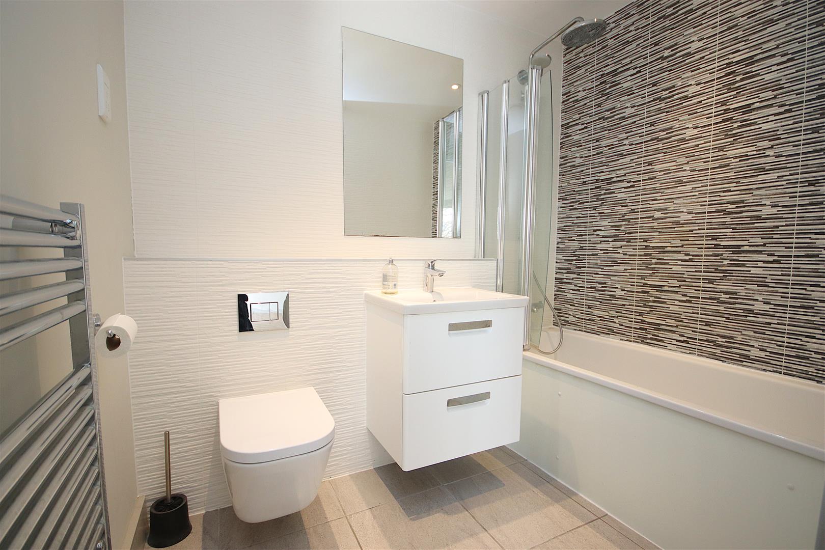 Modern fitted bathroom with shower over bath, WC, hand basin with storage, mirror and heated towel rail