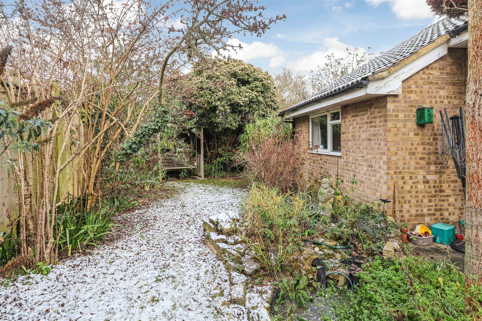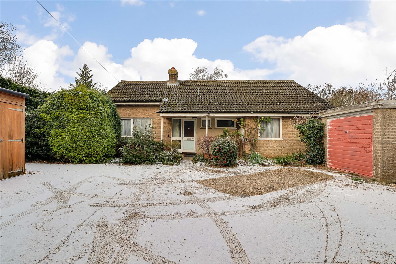 Outside is a long gravel driveway allowing access to a parking space and a single garage. Gated side access to the rear garden with a border and lawn surrounded by fencing.